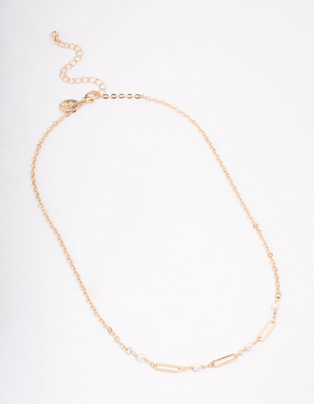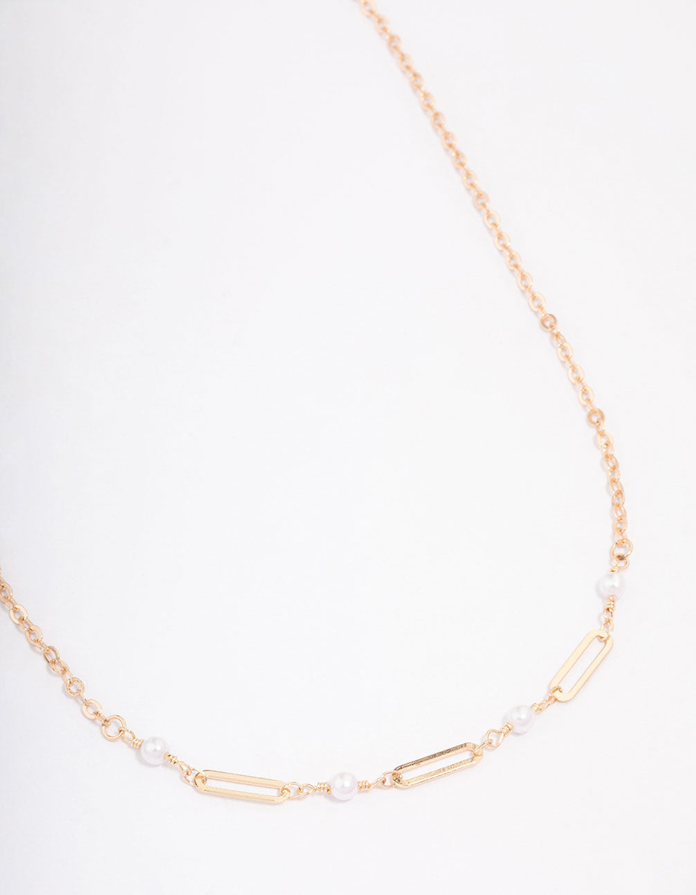 • Gold Pearl Rectangle Link Short Necklace - link has visual effect only