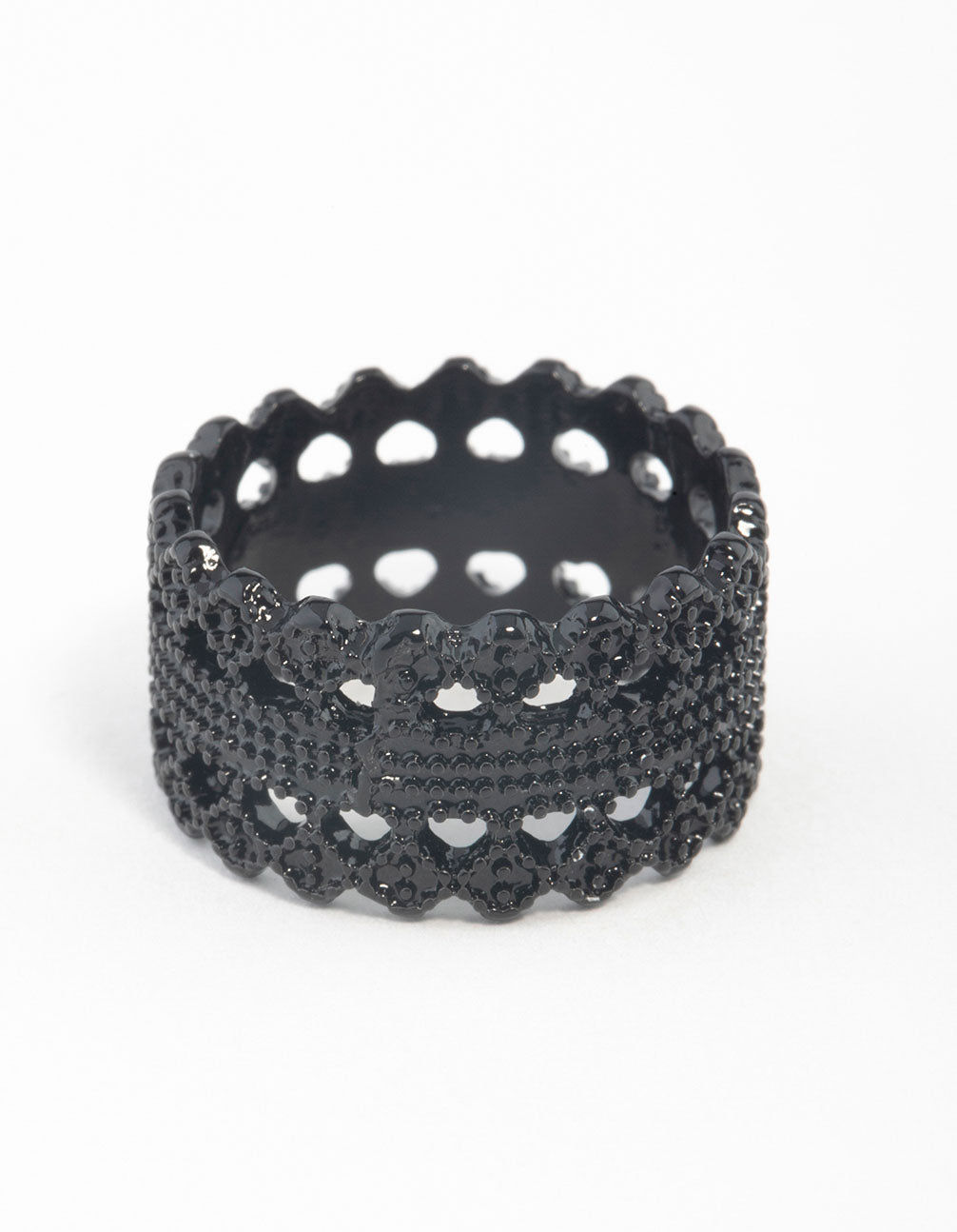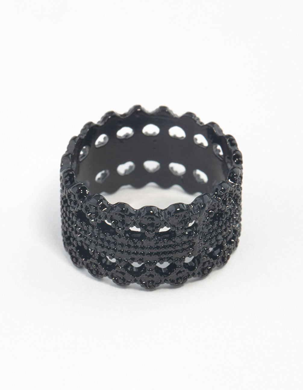 Loving the lace look? This ring is for you! This black-toned ring has lace trim details. Wear alone with an all black look for full effect or stack with coloured rings for a dramatic look.