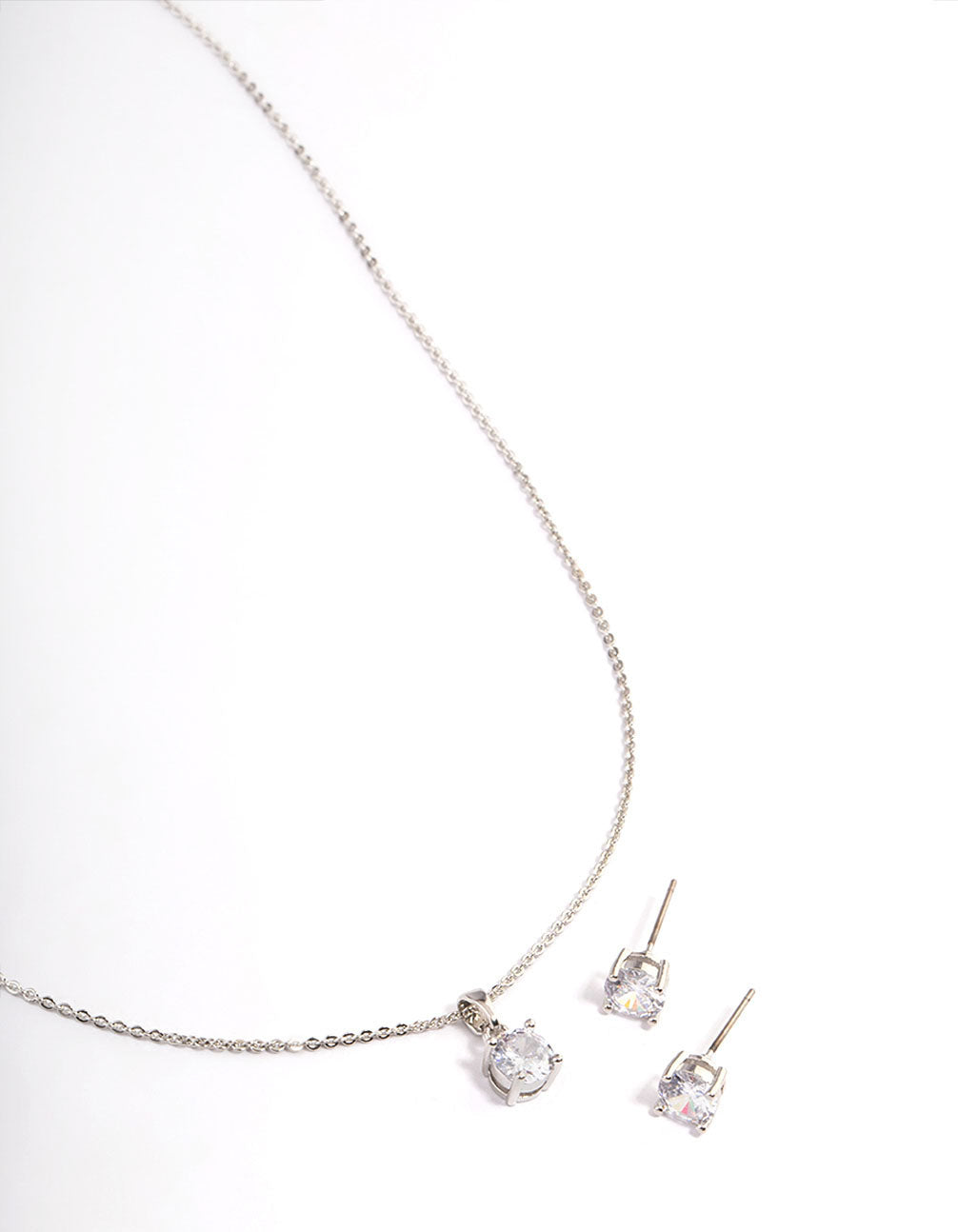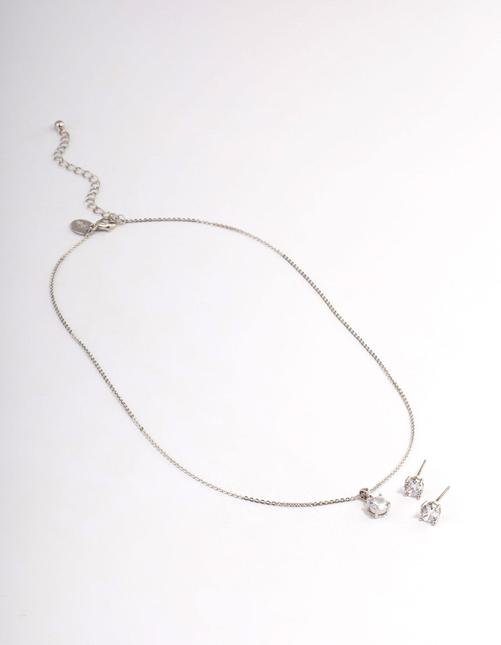 Silver Cubic Zirconia Solitaire Earrings & Necklace Set