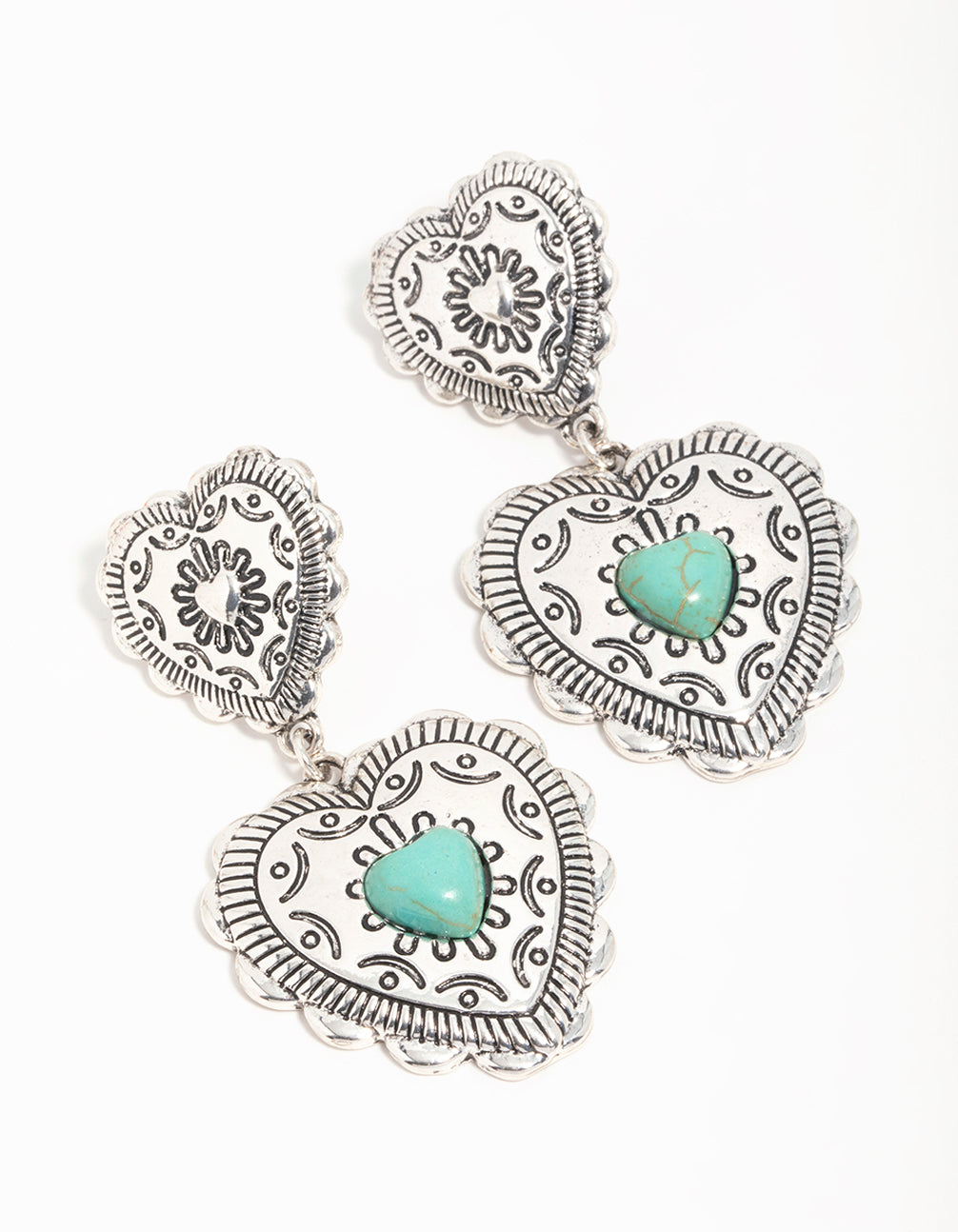 Add a touch of romance to your jewellery collection with these Antique Silver Turquoise Double Heart Drop Earrings. These stunning drop earrings feature a charming double-heart design crafted in antique silver, with eye-catching turquoise stones adding a pop of colour. Perfect for those who love unique earrings or heart-shaped jewellery, these beauties strike the perfect balance between vintage elegance and modern flair. Whether you're dressing up for a date night, a festival, or simply adding a statement piece to your everyday outfit, these earrings are endlessly versatile. Pair them with a flowy dress or a chic blouse and jeans for an effortlessly stylish look. A must-have for anyone seeking a bold yet feminine accessory!