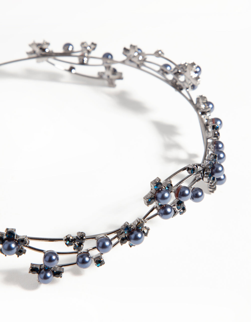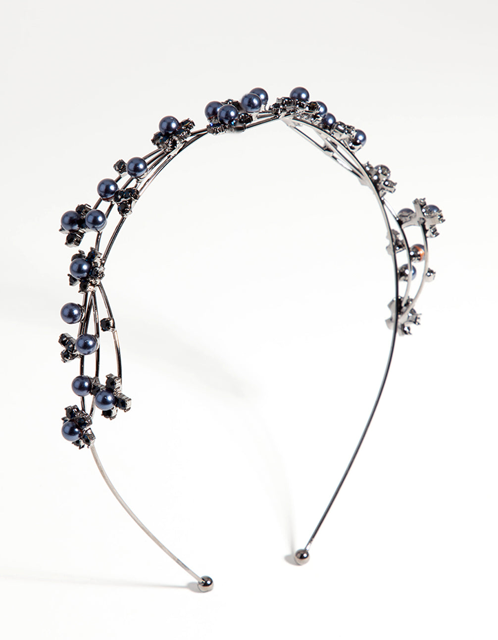 Add a touch of whimsy to your outfits by experimenting with hair accessories. This gorgeous gunmetal toned headband features midnight-blue faux pearls and glittery navy diamantes. Wear it to elevate your evening edits, or during the day for a dramatic look.