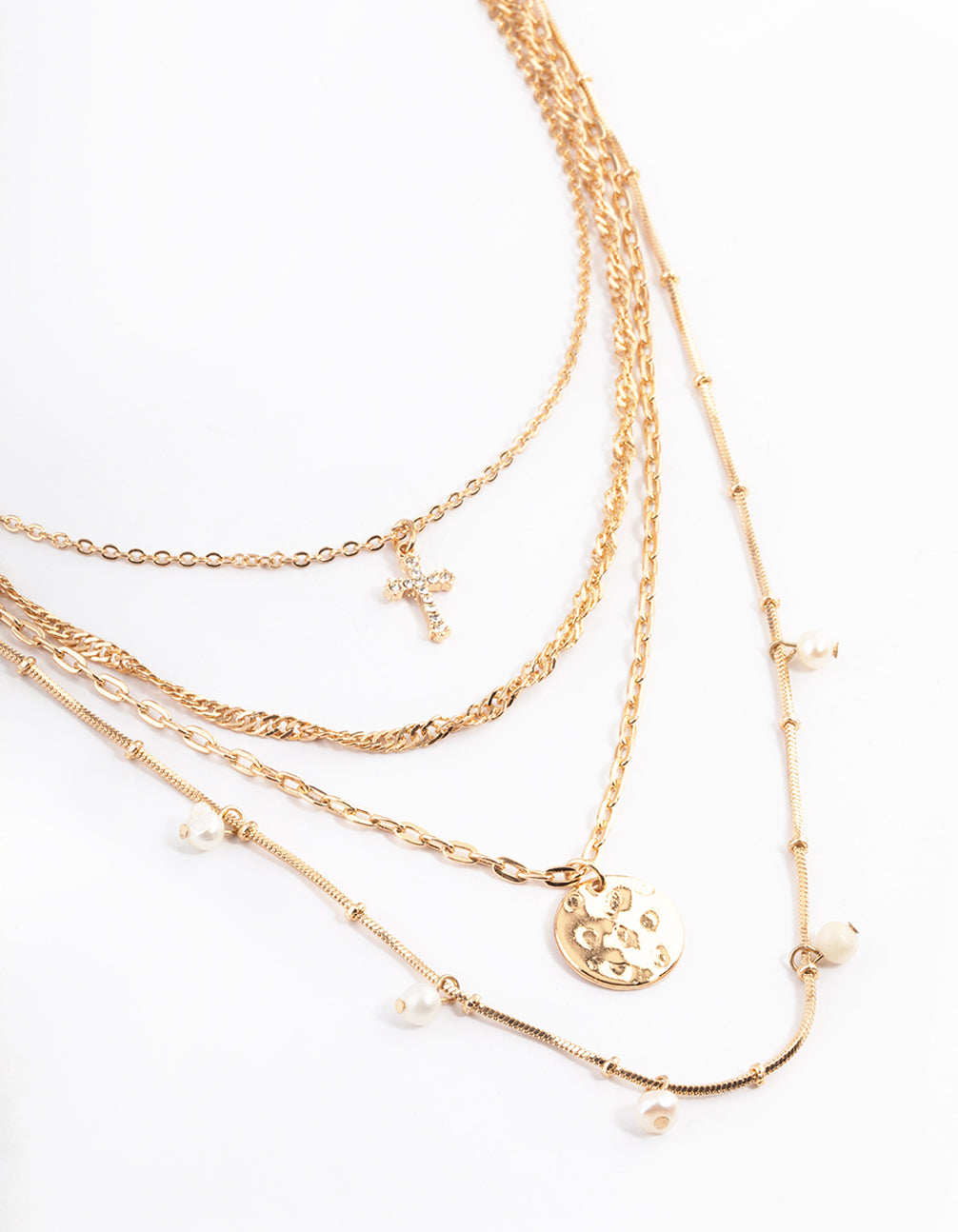 - Pair our gold-toned pearl layered cross necklace with matching accessories from our Semi Precious Collection for a unique look.