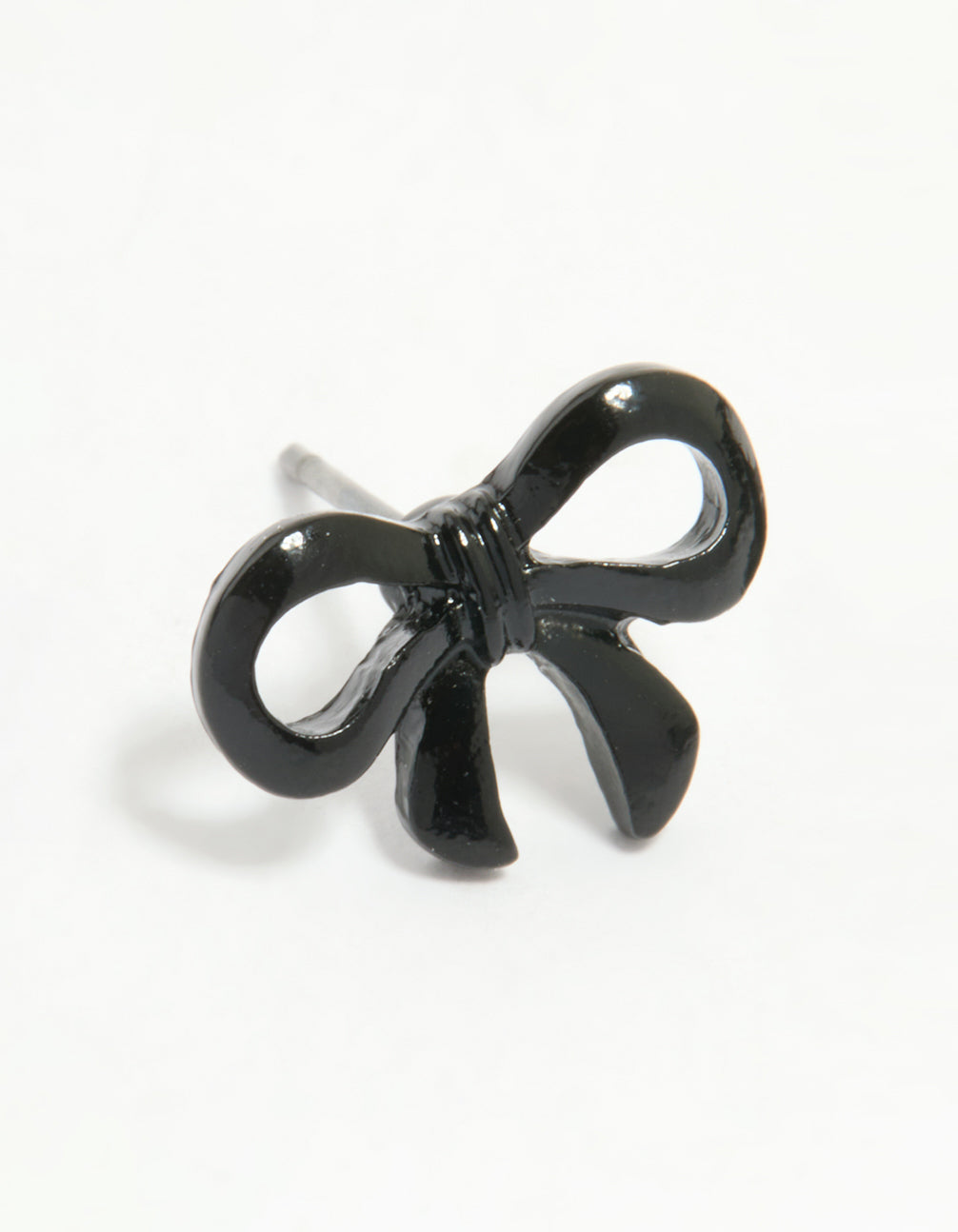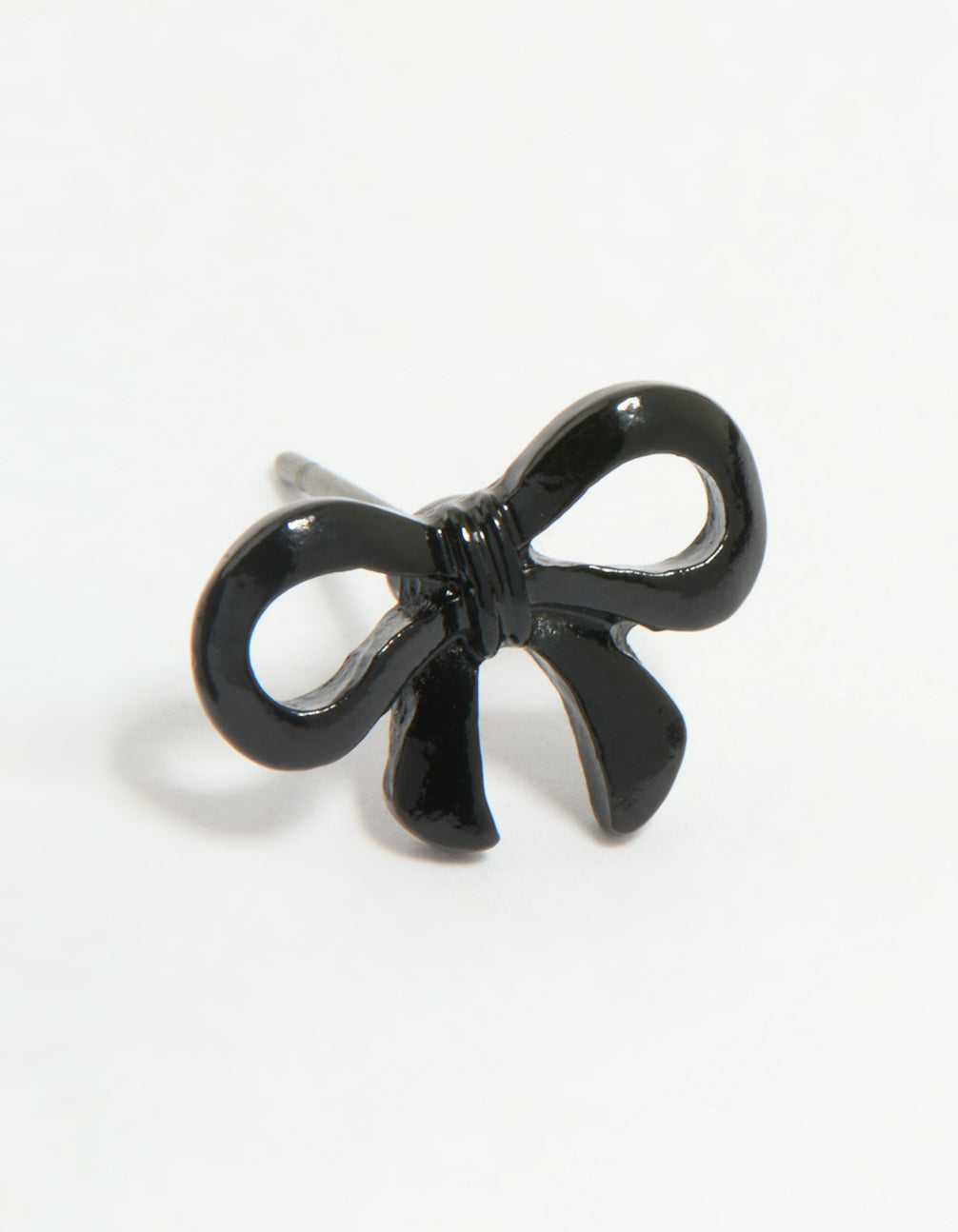 Add a playful twist to your accessory game with these Black Coated Metal Ribbon Bow Stud Earrings. These stylish stud earrings feature a charming bow shape, perfect for adding a touch of elegance to any outfit. Crafted from coated metal, their sleek black finish makes them versatile and effortlessly chic, ideal for day or evening wear. Whether you're dressing up for a dinner date, heading out for coffee with friends, or elevating your everyday look, these ribbon earrings are a great choice. Pair them with a leather jacket for an edgy vibe or with a flowy blouse for something more feminine.