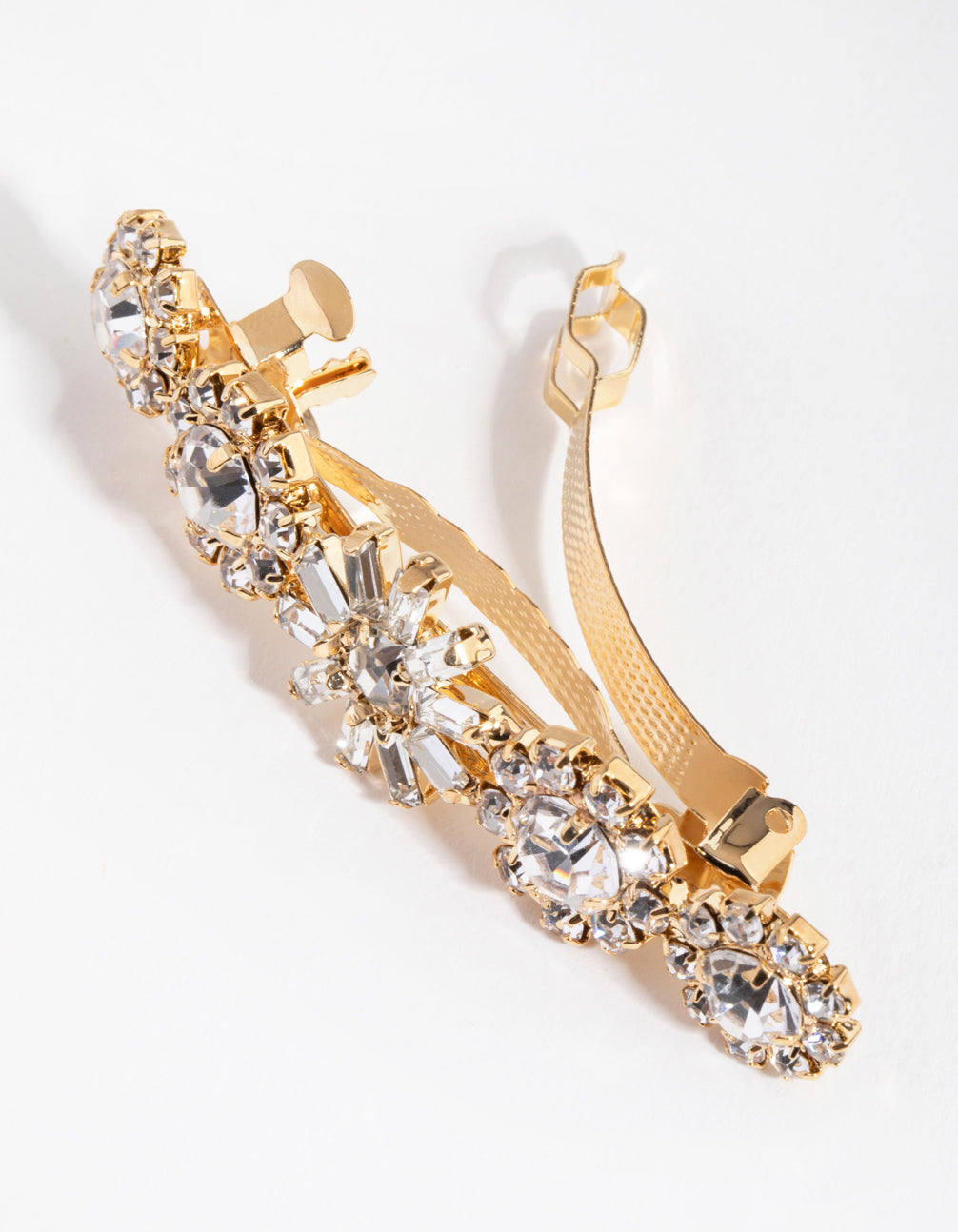 Add a chic finishing touch to your look with fashion-forward hair accessories! On a gold-toned setting, this clip boasts stunning diamante-coated flowers that are sure to give your outfit a pretty finish. Layer with other gold-toned accessories for maximum impact.