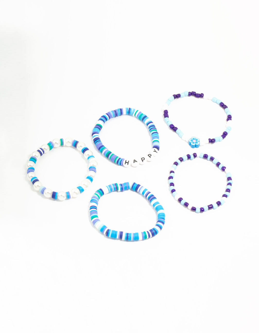 Blue Beaded & Happy Flower Stretch Bracelets 5-Pack