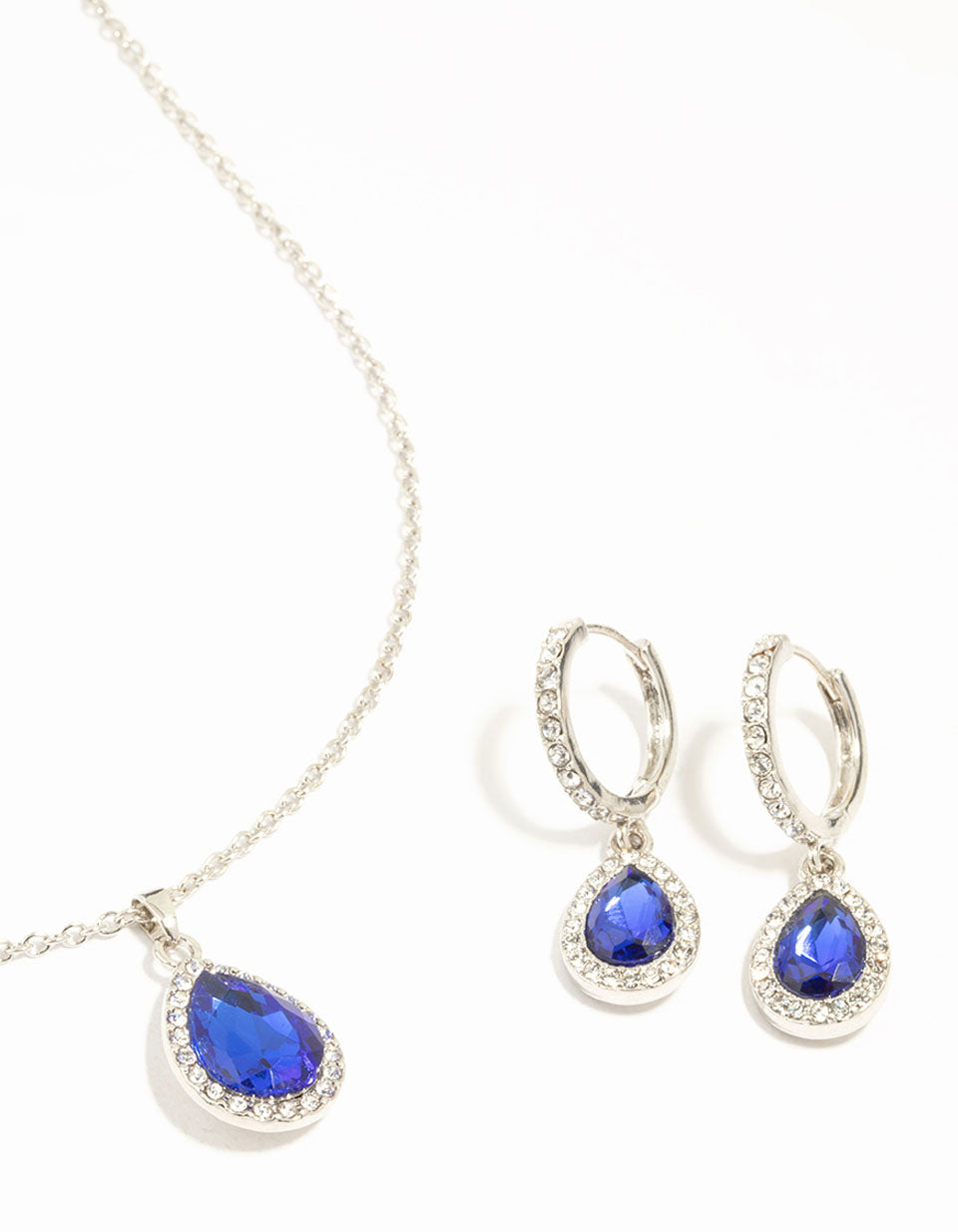 Silver Blue Diamante Halo Necklace & Huggie Earrings Set