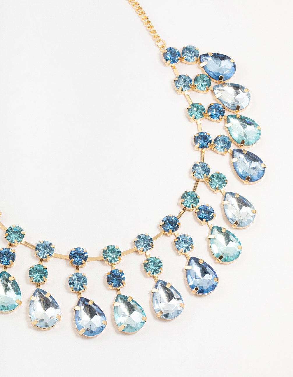 Turn heads with this stunning statement necklace. This necklace features a luxe gold base and three rows of sparkling blue crystals in a choker style. Perfect for drawing attention to your neck and for rocking a colourful yet elegant look.