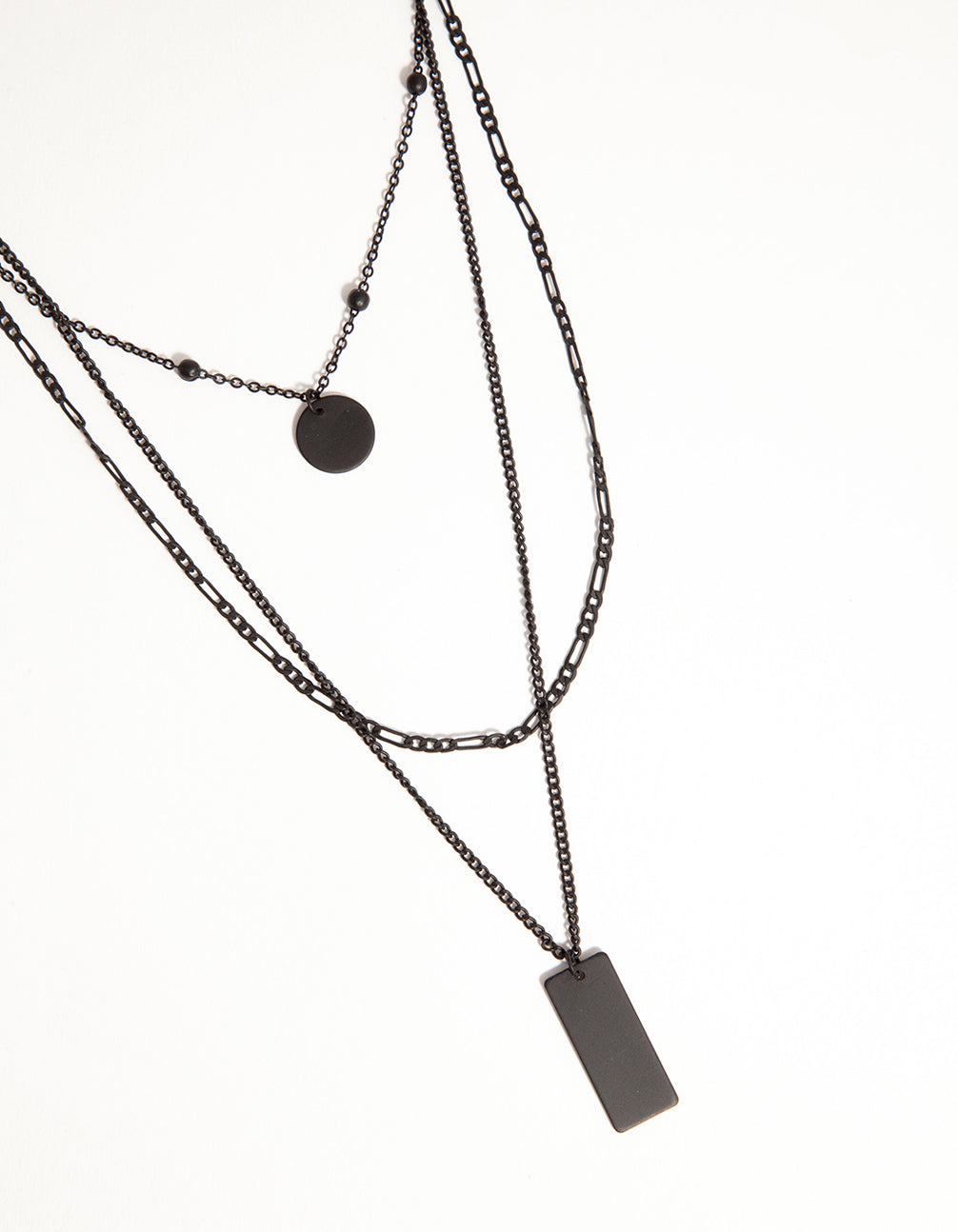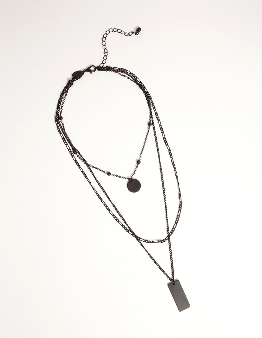 Elevate your wardrobe with a stunning statement necklace. This black-toned piece is comprised of three layers, with a rectangular pendant attached. Pair this with some denim for an on-trend look.