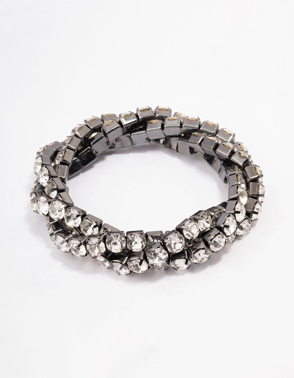 - This gorgeous bracelet features a gunmetal setting adorned with large, round diamantes that wrap around the wrist for a multi-dimensional feel.