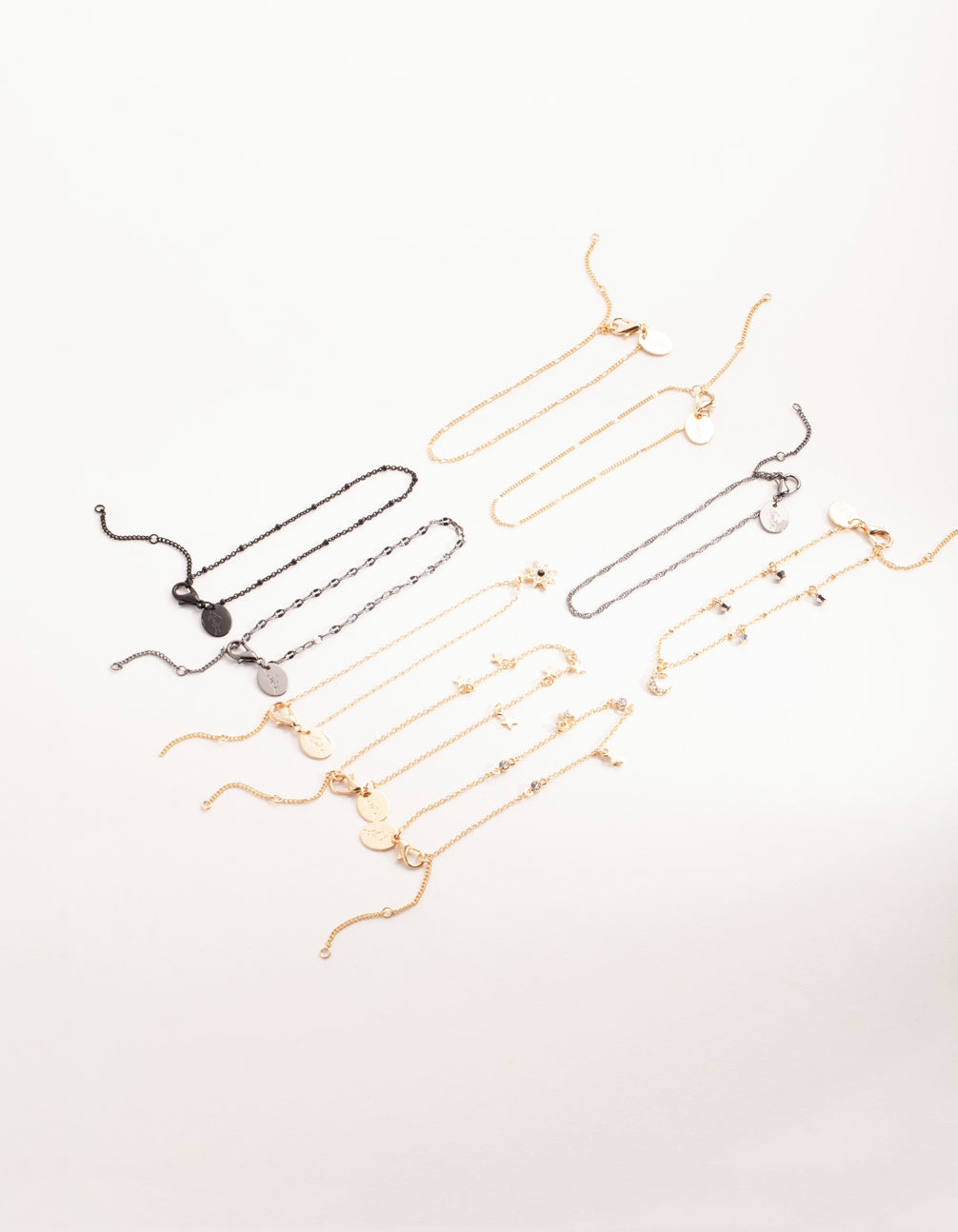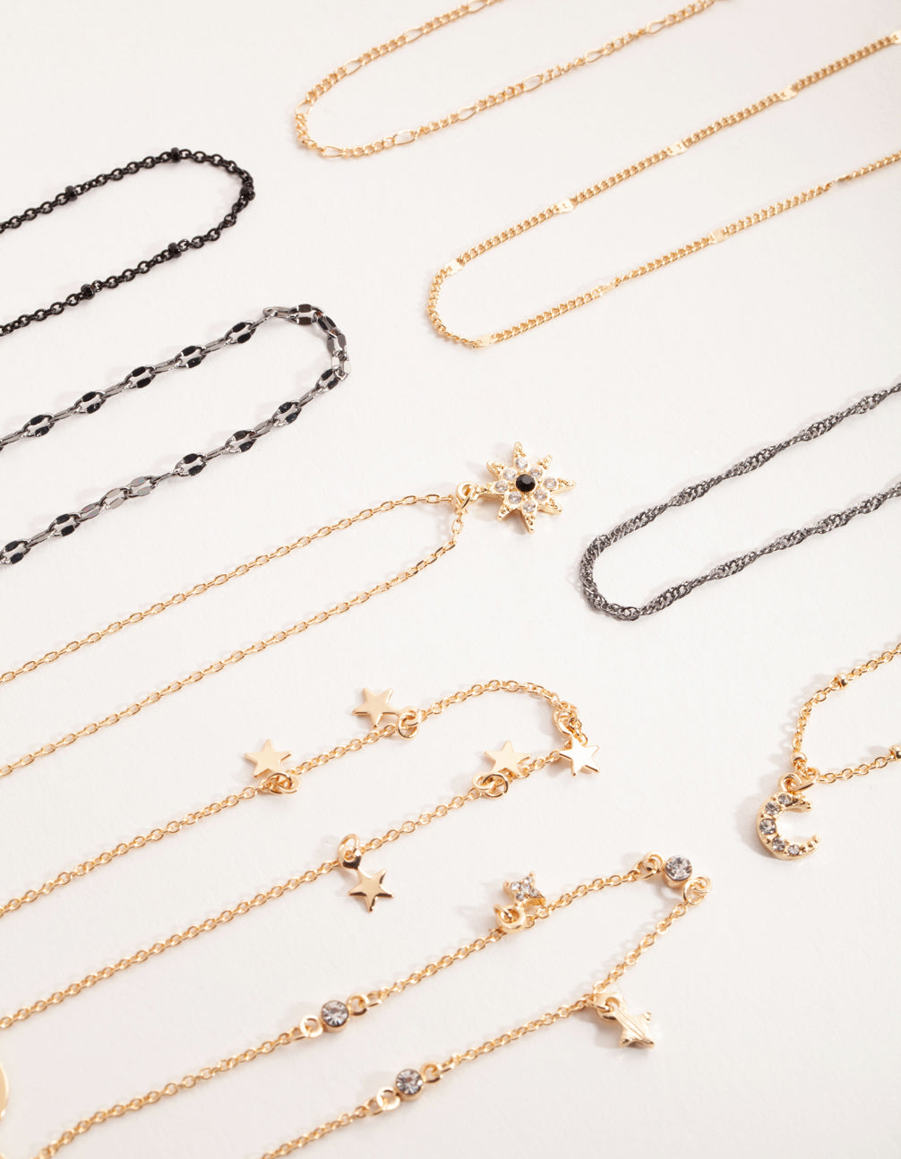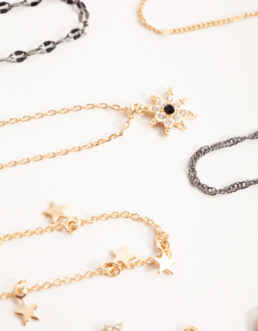 Round out your collection with a fashion-forward bracelet pack. This set includes multiple black and gold-toned bracelets that are adorned with stunning celestial charms. Stack and layer to your hearts content!