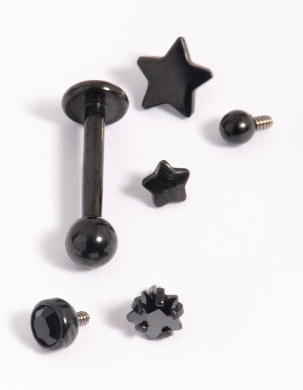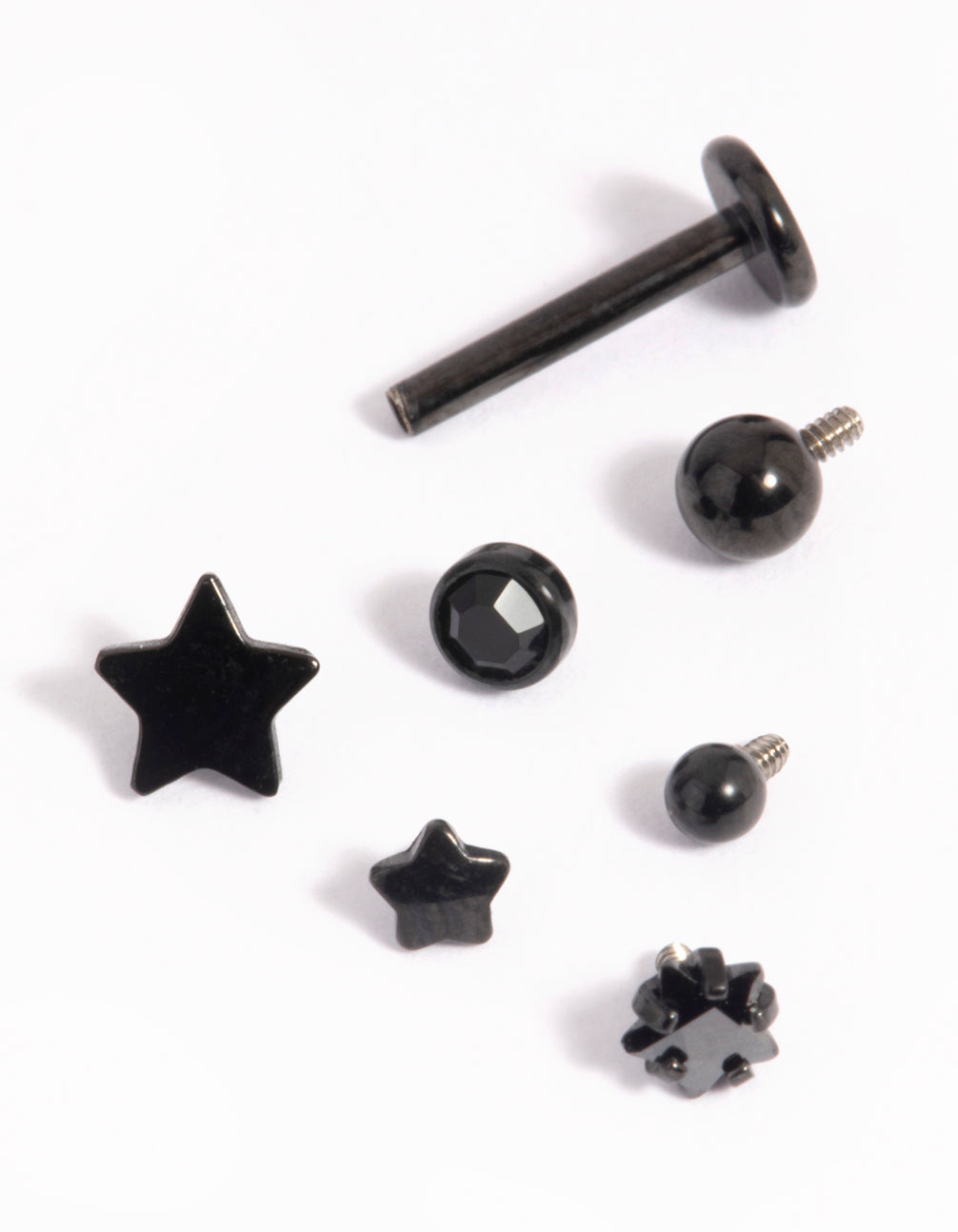 Switch up your style with this Matte Black Surgical Steel Single Flat Back Bar & Diamante Star Interchangeable Ends Pack! This versatile jewellery set features one sleek matte black surgical steel flat-back bar paired with six dazzling screw-on ends, including gorgeous diamante and star designs. This set lets you customise your look effortlessly, go subtle with a single star or mix and match for a bold celestial vibe. Crafted from durable surgical steel, it’s a comfy, all-day option that’s great for sensitive skin. Ideal for casual hangouts, parties, or adding a little sparkle to your everyday outfit, the interchangeable designs pair beautifully with anything from a laid-back denim jacket to a chic party dress.