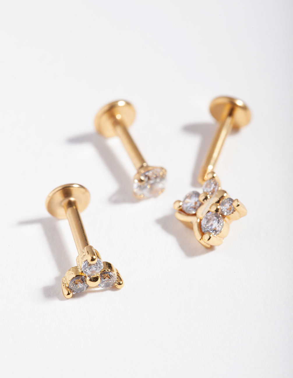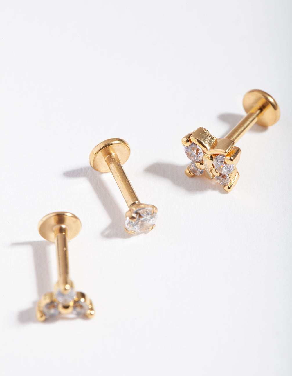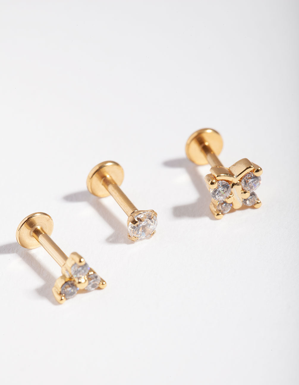 - Stack and layer with this curated flat back pack! This set includes three gold-toned piercings that boast diamante detailing. They have a gauge of 16 and are 1.2mm in length. They have surgical steel posts.