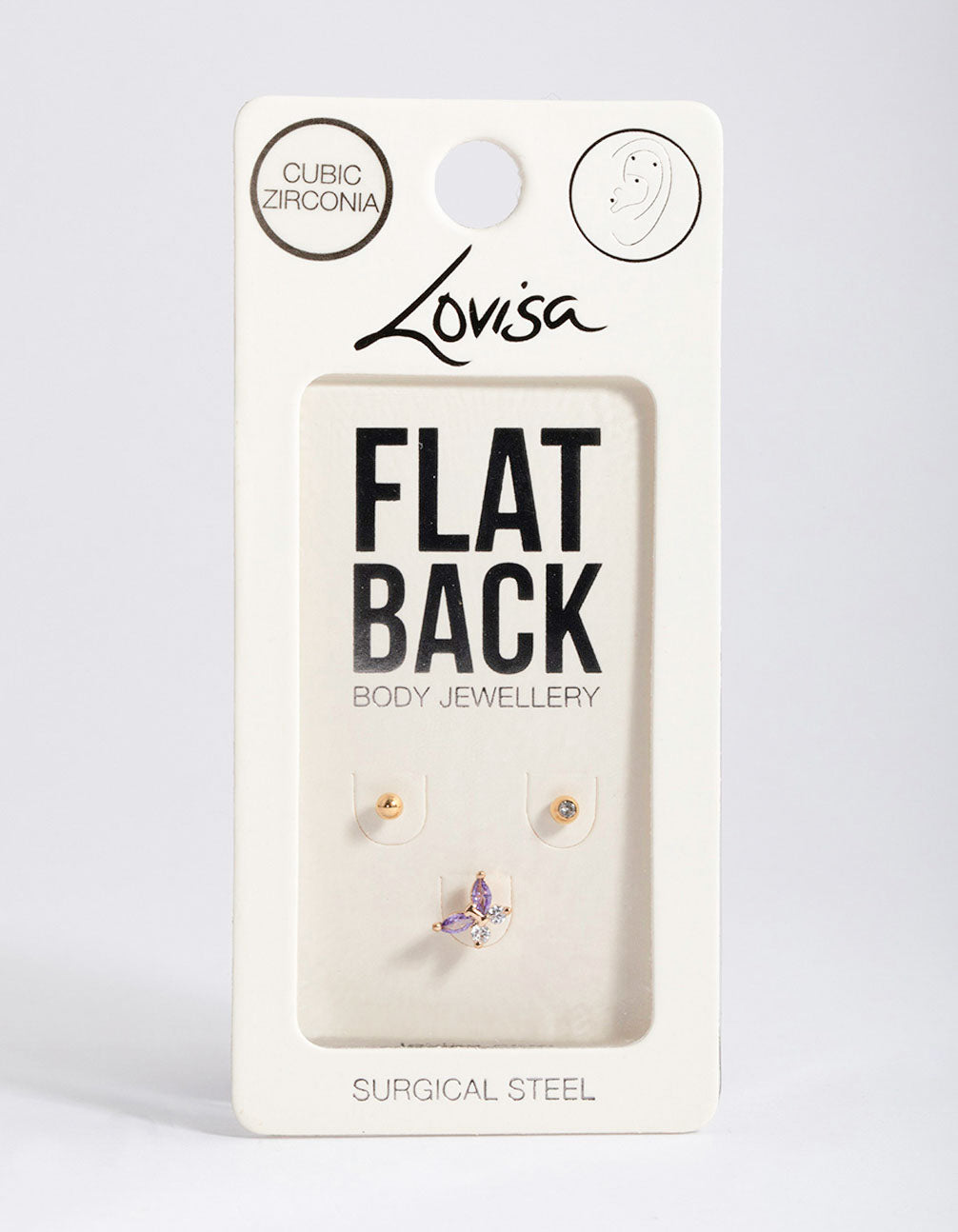 - This flat back piercing is plated with real gold and features cubic zirconia crystals in a butterfly formation for a Y2K-inspired finish. Flatbacks can be styled as versatile ear piercings, perfect for helix, tragus and conch placements.