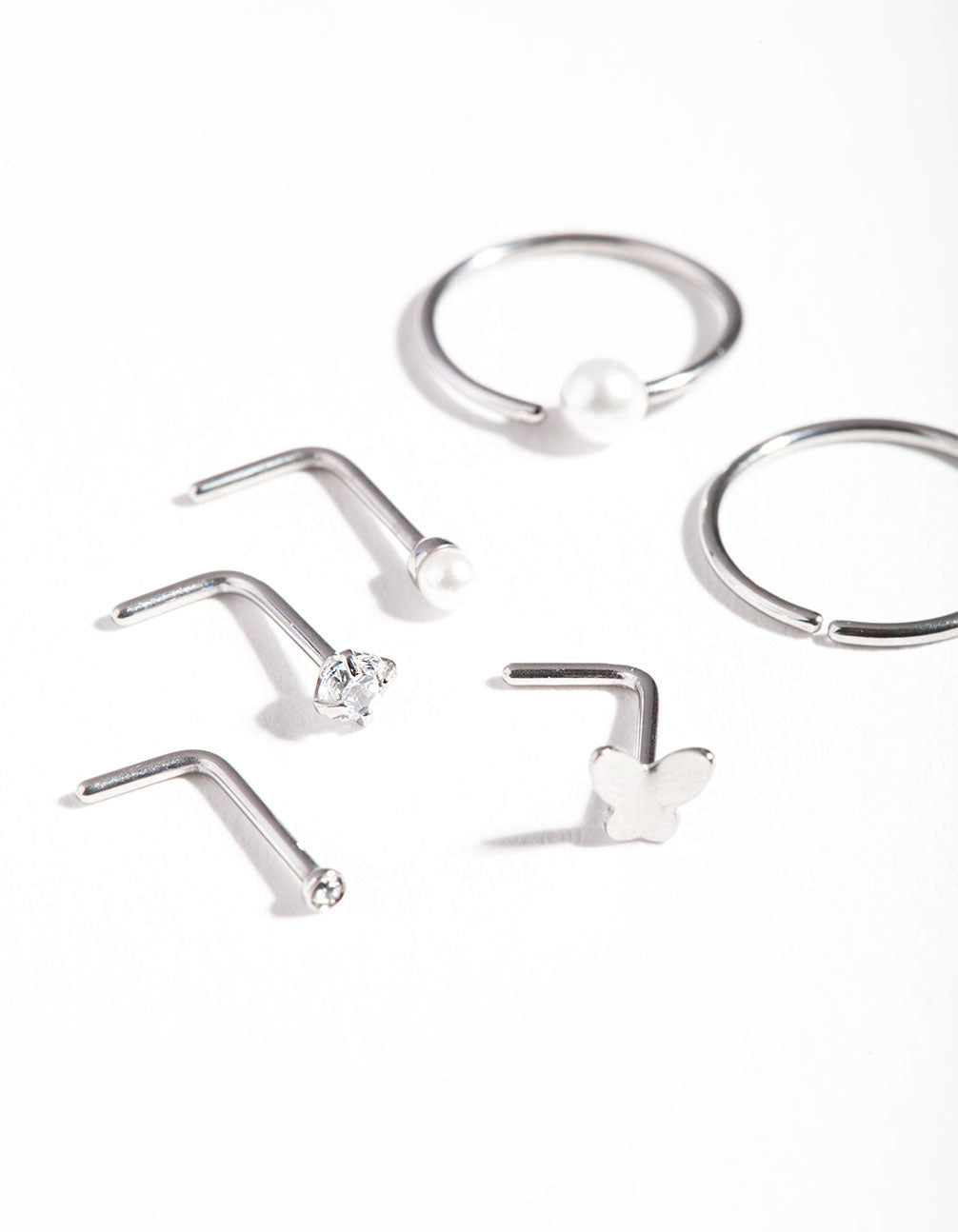 Lovisa body jewellery is made from surgical steel, making it the perfect option for everyday wear. This collection has been made with piercings in mind and features both trend-led and classic styles that you can swap out to suit any occasion. This pack comes with 6 different nose studs and hoops with a butterfly motif, mini diamante and faux pearl embellishments. Mix and match your nose rings to coordinate with gold-toned and pearl accessories for a fashion-forward look!