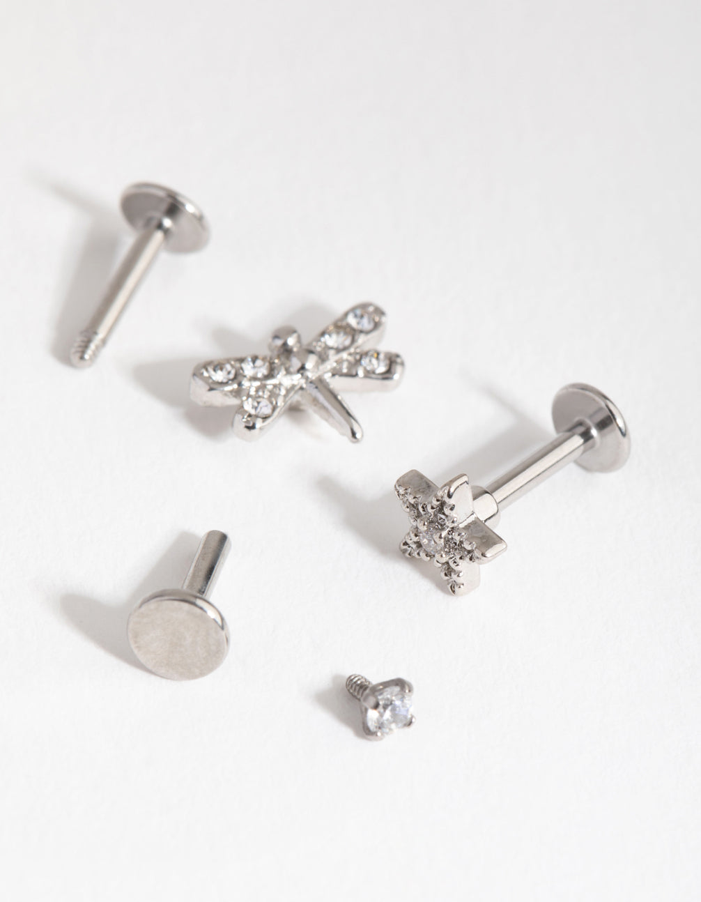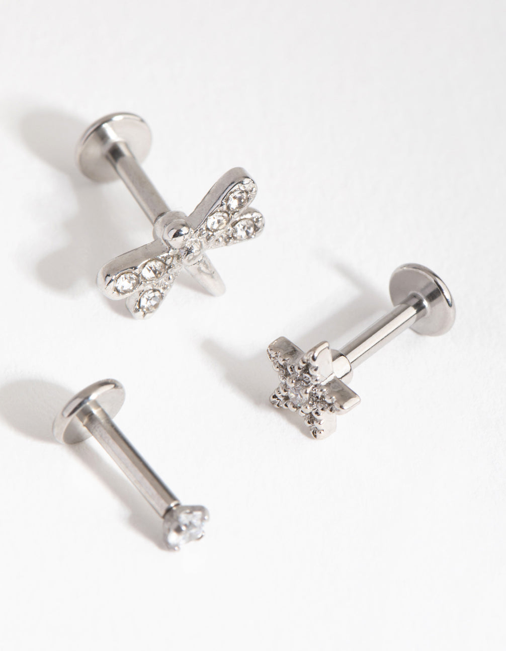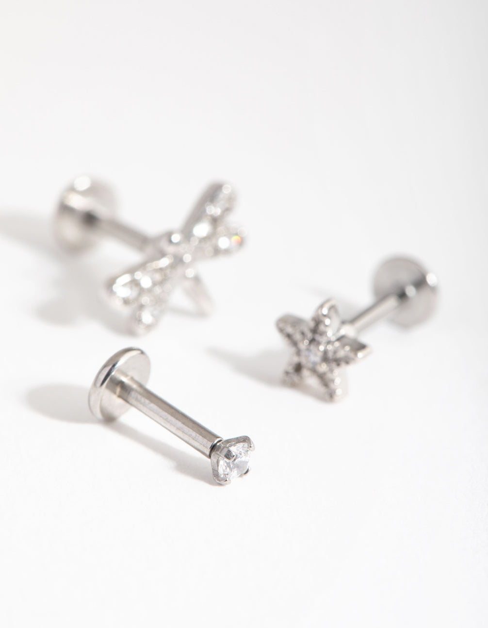 Show off the individual you are with the Lovisa Body Jewellery Collection. This set includes three silver-toned earrings which have been made with surgical steel to ensure they are more gentle on skin. They're flat backs, providing greater comfort for day-to-day wear. Designs include glittering diamantes and star and dragonfly motifs. The gauge measurement is 16G/1.2mm.