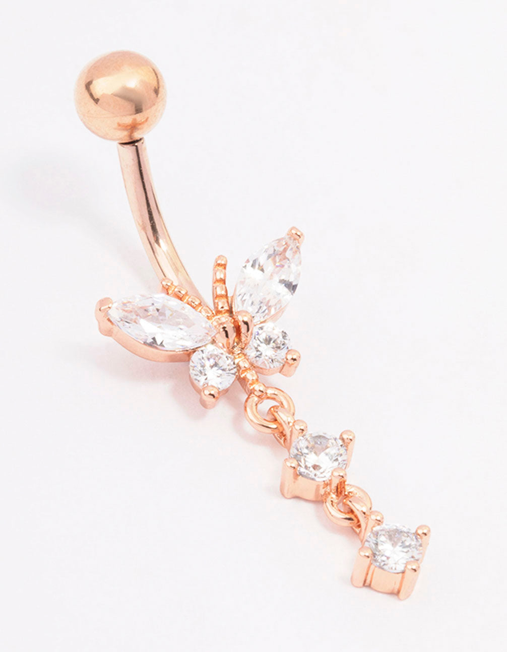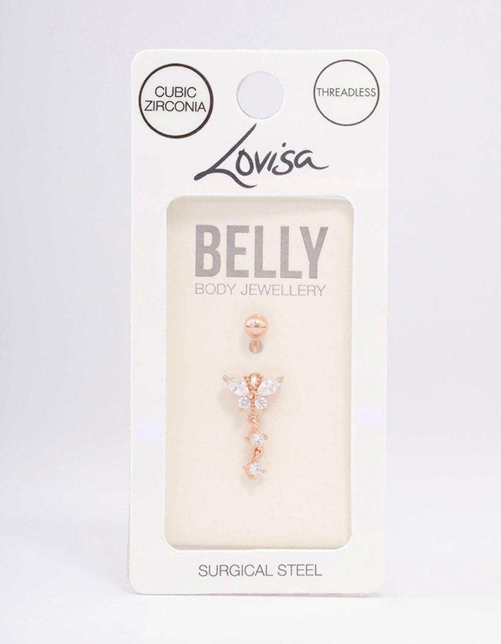 Discover premium piercing jewellery at Lovisa! Our collection of body jewellery is crafted from surgical steel, a durable material that's safe for sensitive skin and long-lasting wear. This belly bar is plated with rose gold plated surgical steel and features a dainty cubic zirconia butterfly charm — perfect for adding interest to your look.