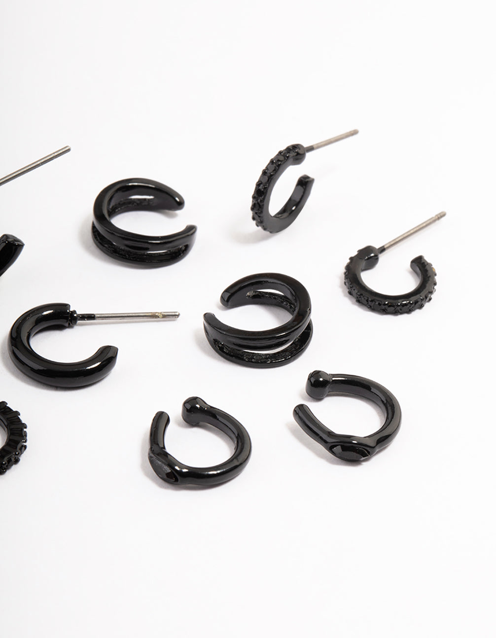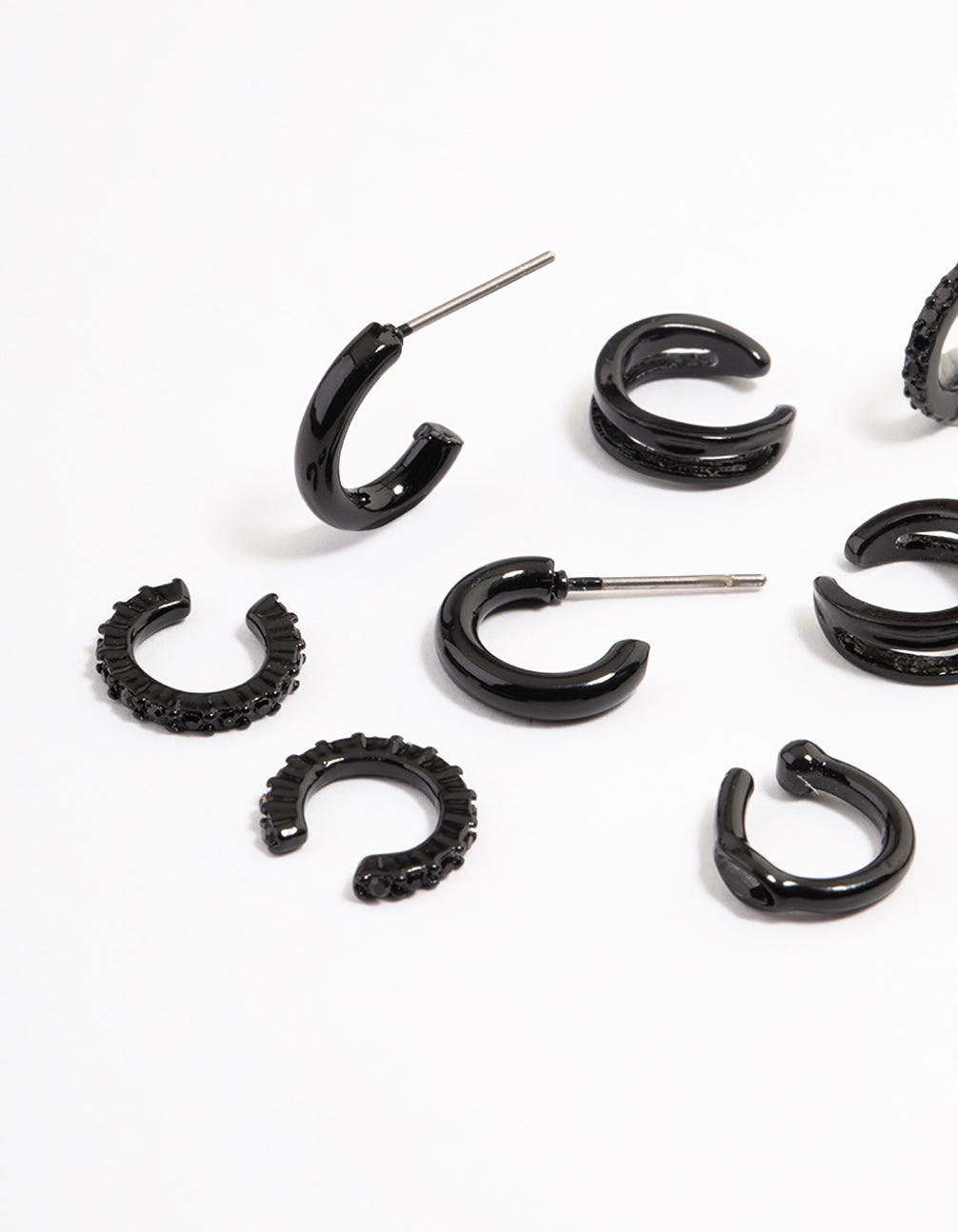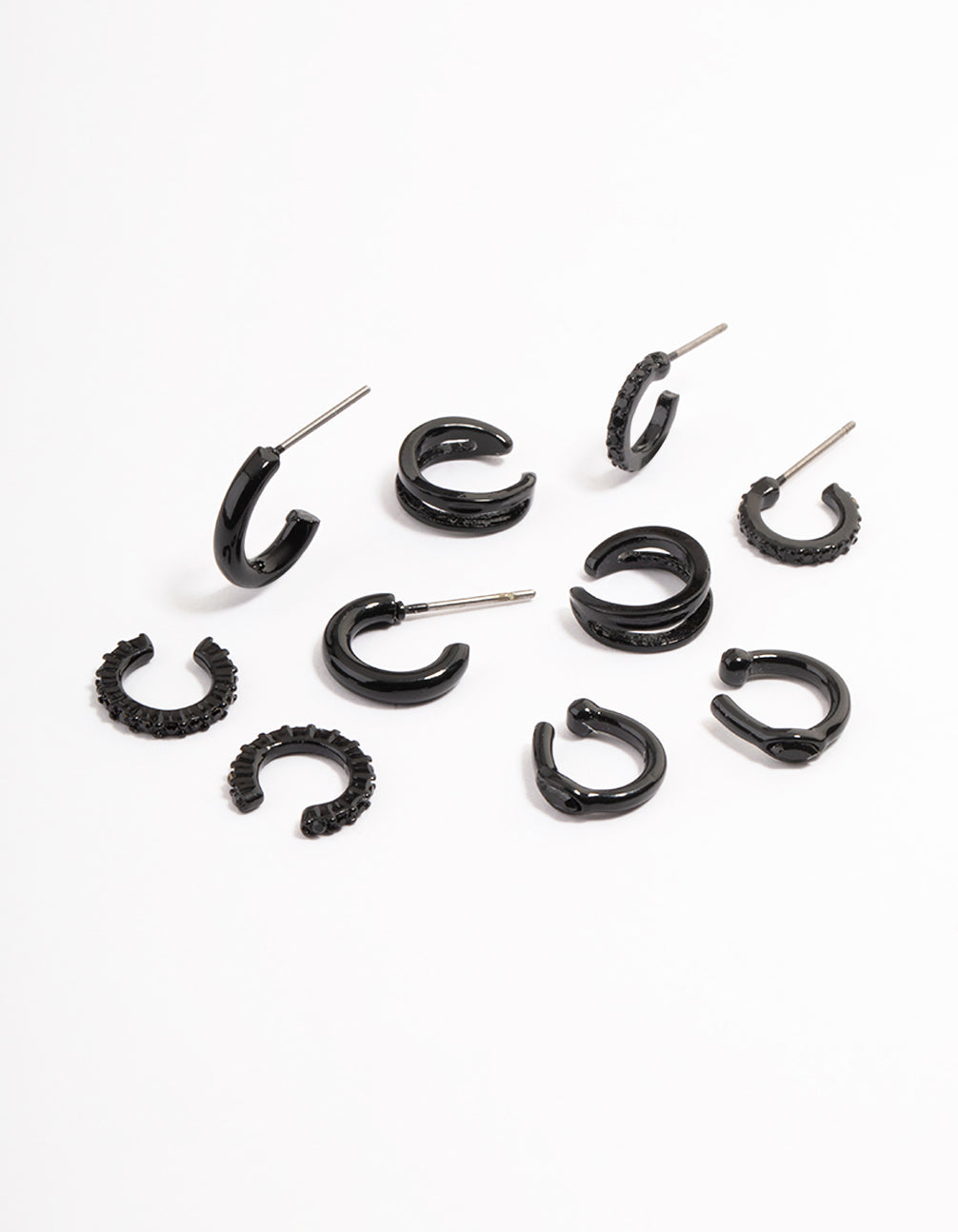 Treat yourself to some ear candy from our Curated Collection! Style this assorted pack of huggie hoop earrings with trending accessories from our Black on Black collection.