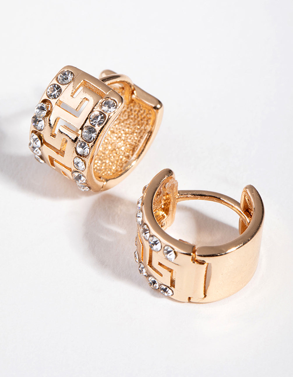 Add a chic edge to your look with a fashion-forward pair of huggie earrings. These earrings are gold-toned and boast Grecian-inspired detailing with diamante borders. Perfect for transitioning from day to night.
