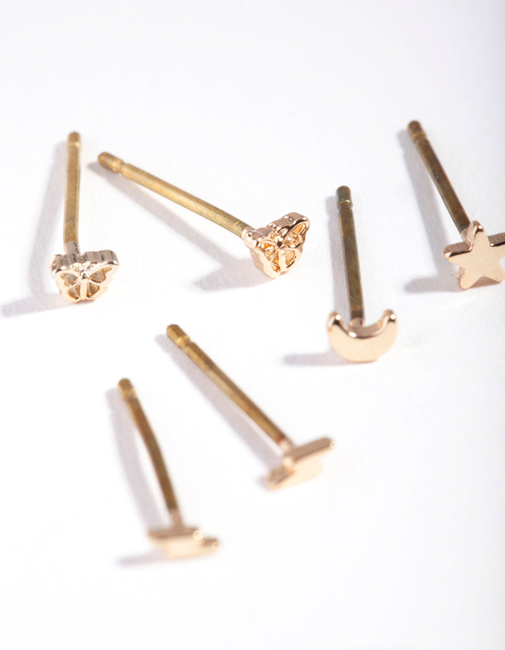 Layer up and create the perfect ear stack with a Lovisa micro earring stack pack! This pack features a variety of miniature gold-toned earrings, including a star and moon design.
