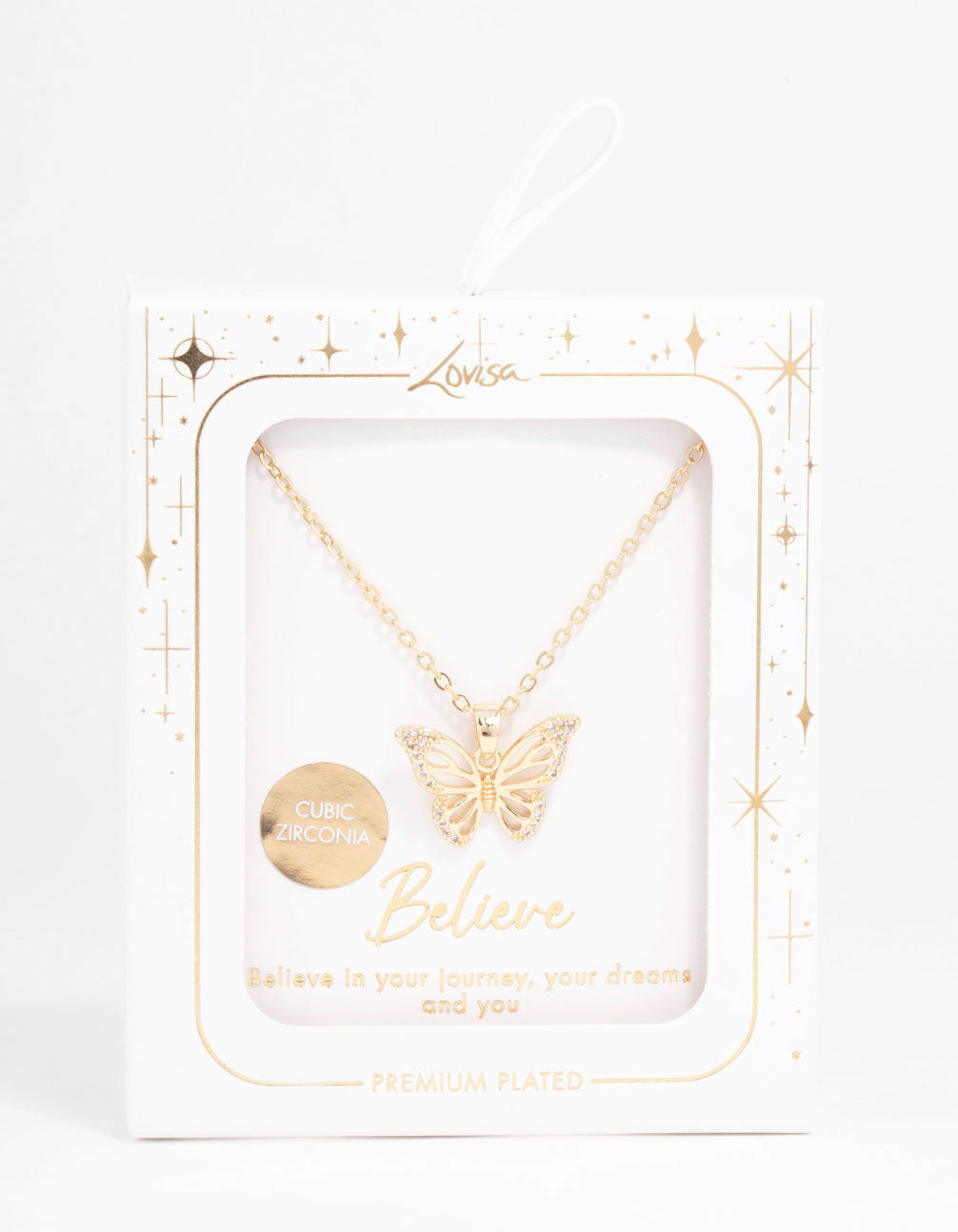 Surprise your loved one with this beautiful gold plated necklace featuring a stunning butterfly pendant encrusted with cubic zirconia. It comes elegantly wrapped in a gift box for easy gifting.