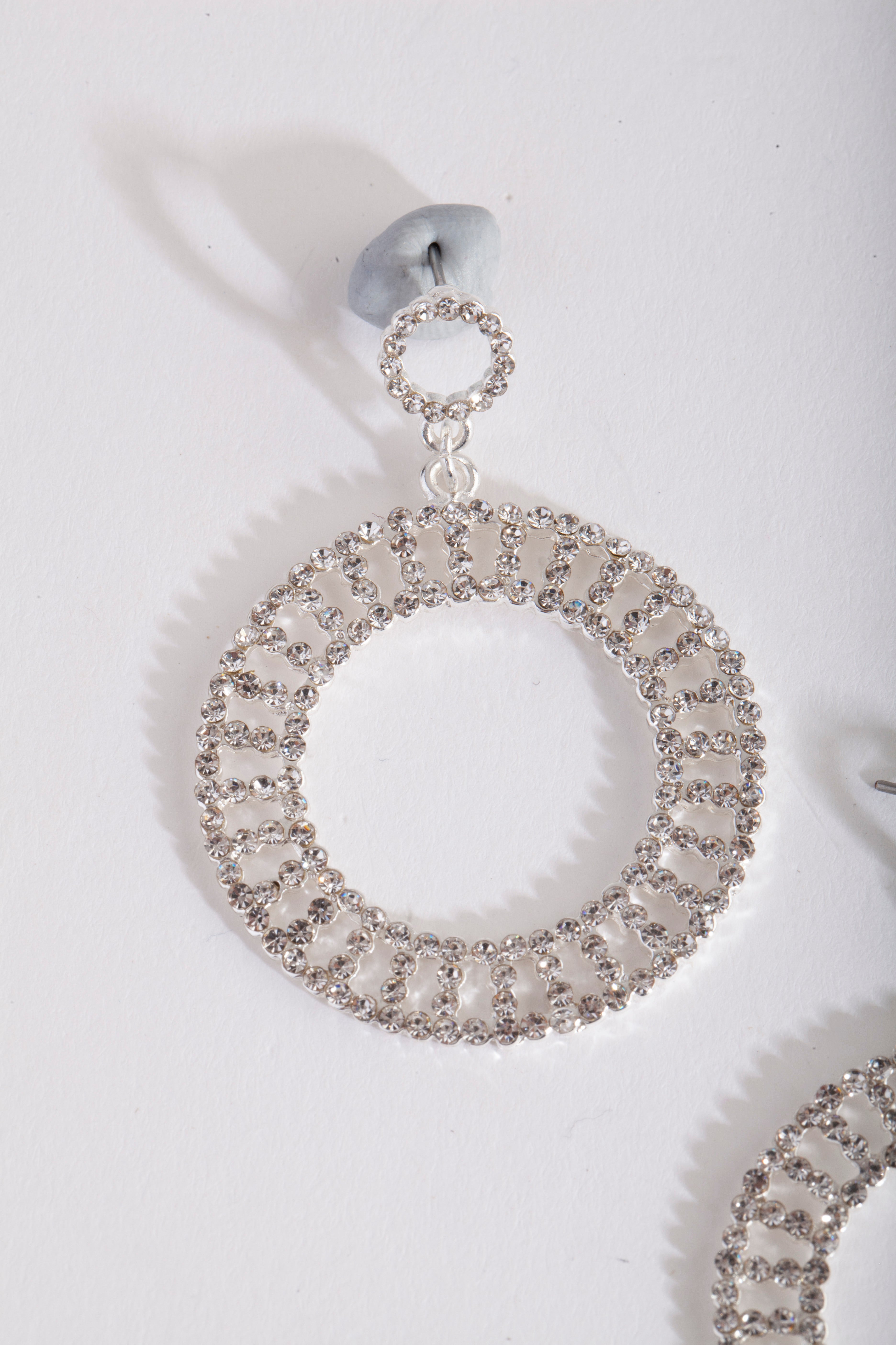 Glimmer and shine with our fun fashion earrings! This stunning earring features a mini diamante embellished round cutout disc design in a silver-tone setting.