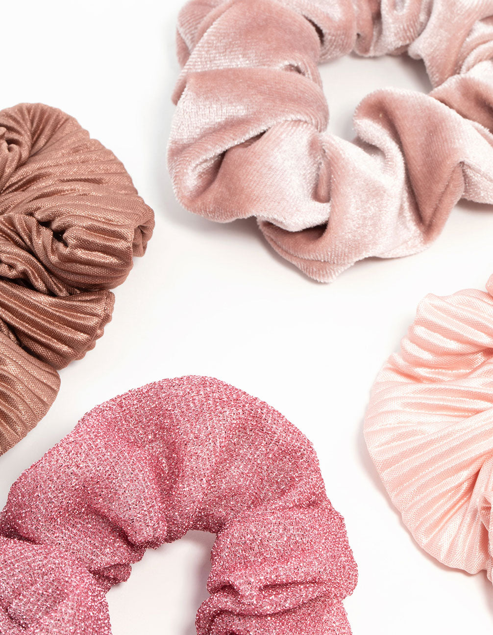 Gift your favourite people beautiful hair every day with this set of four stylish scrunchies. It includes glittery, velvety, and ribbed scrunchies in light and dark pink, perfect for anyone who loves pretty pink tones.