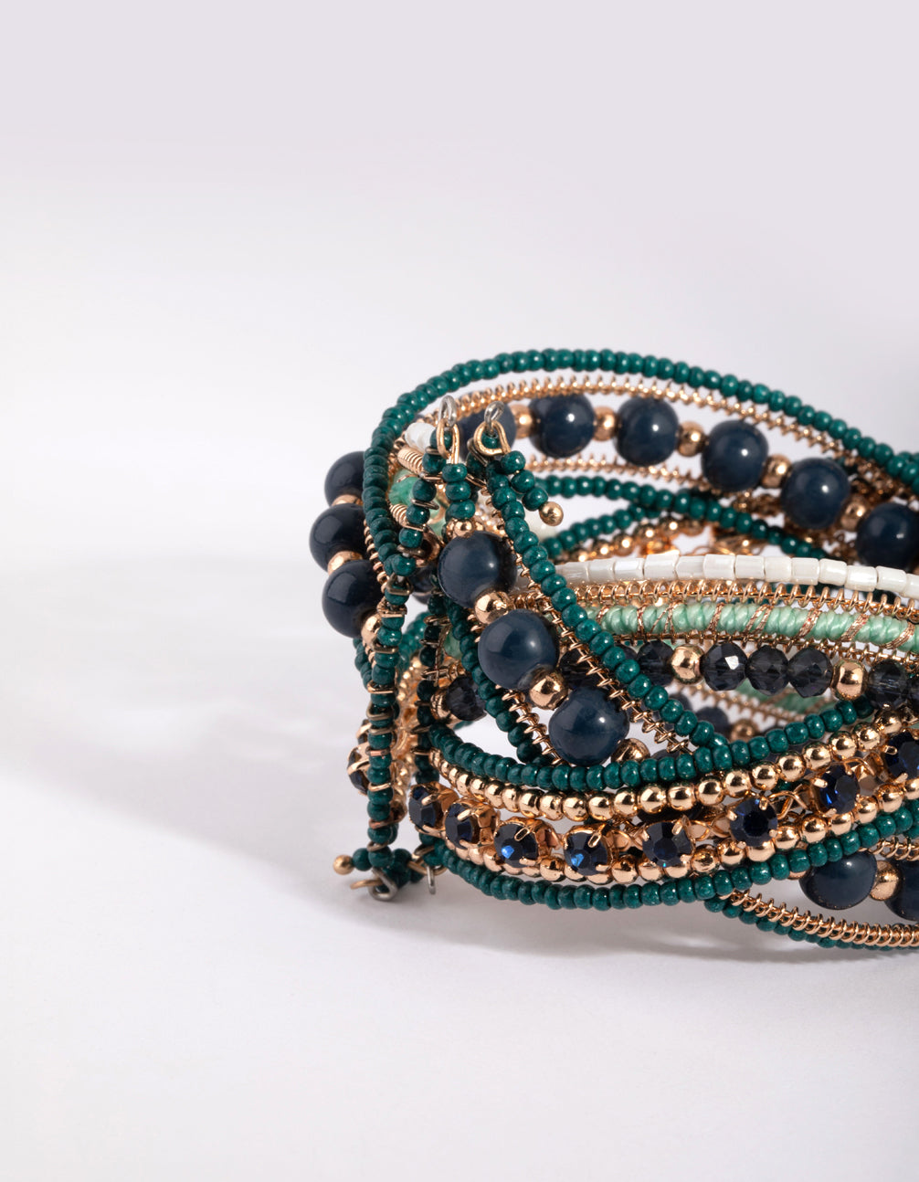 Bring on the beads! This funky bangle features a stunning crossover design with hundreds of beaded embellishments in a mix of green, gold and blues hues. Wear it to add a luxurious finish to a beach look.