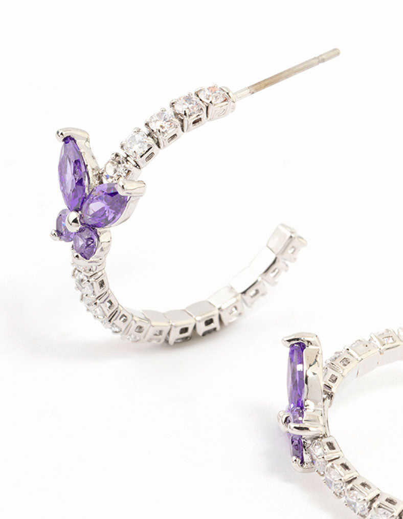 Bring enchantment into your jewellery collection with these Diamante Silver Cupchain Butterfly Hoop Earrings. The purple butterfly motif and diamante crystal combo create a magical finishing touch.