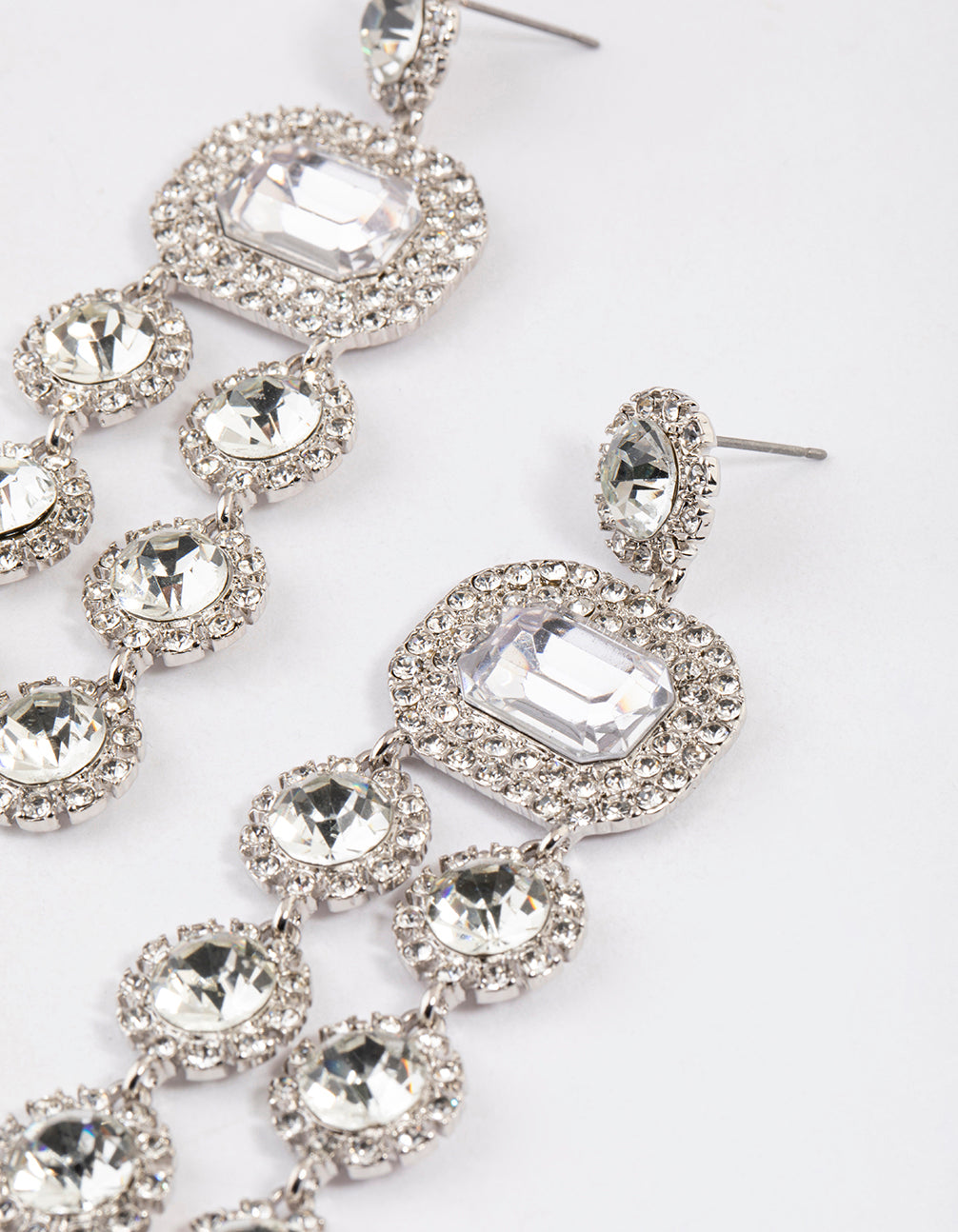 These silver-toned drop earrings feature a large, square diamond encased with smaller diamantes for added shine.