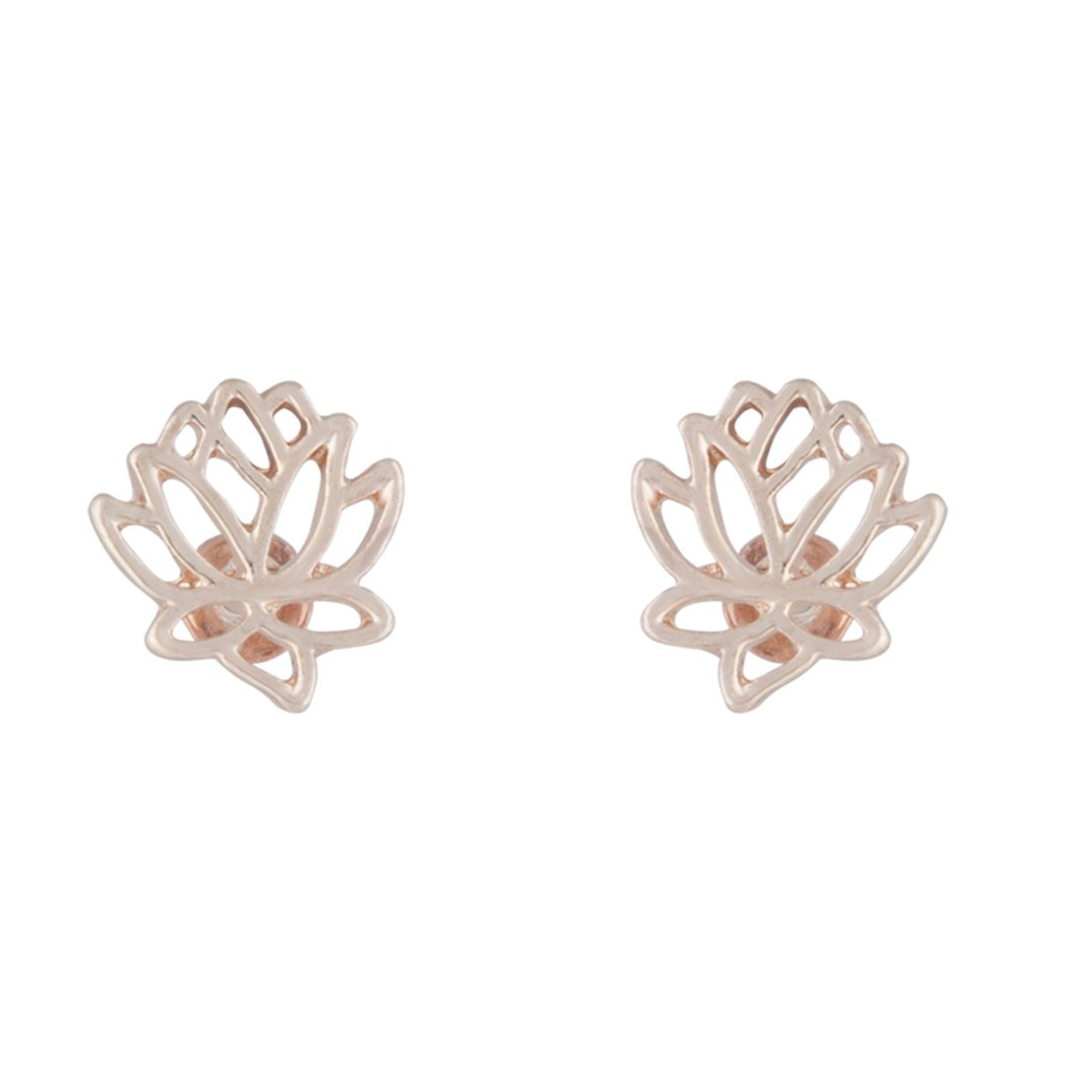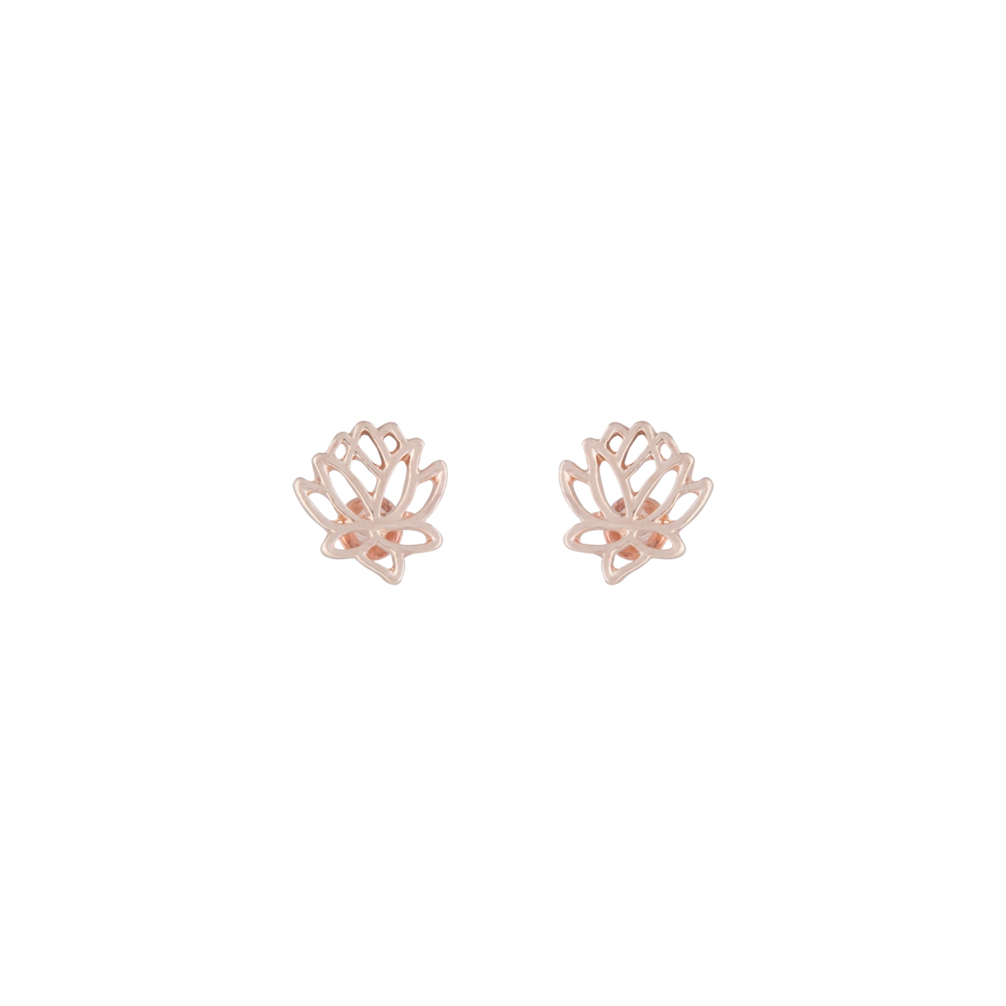 A pair of cutout lotus shaped earrings in a rose gold tone.
