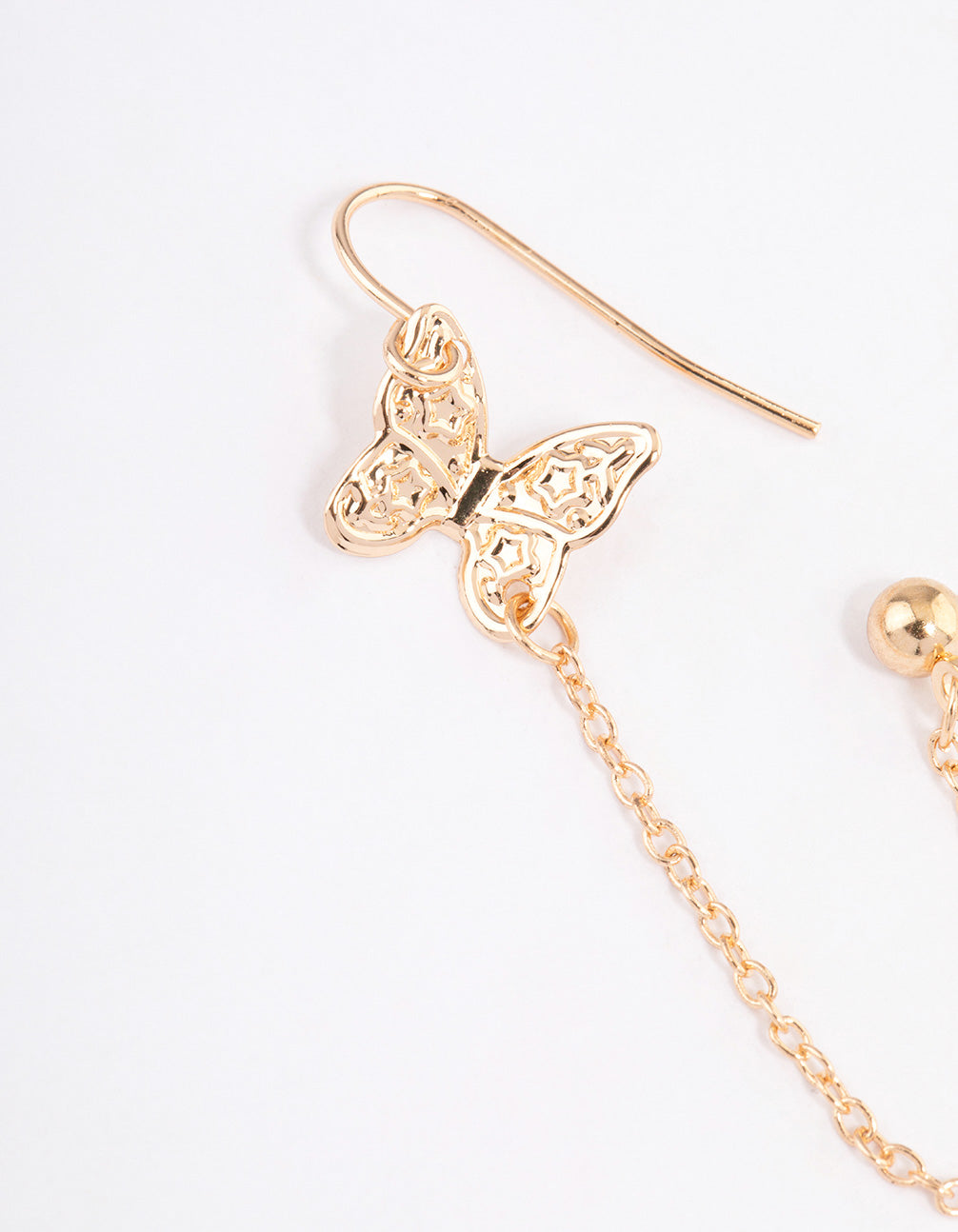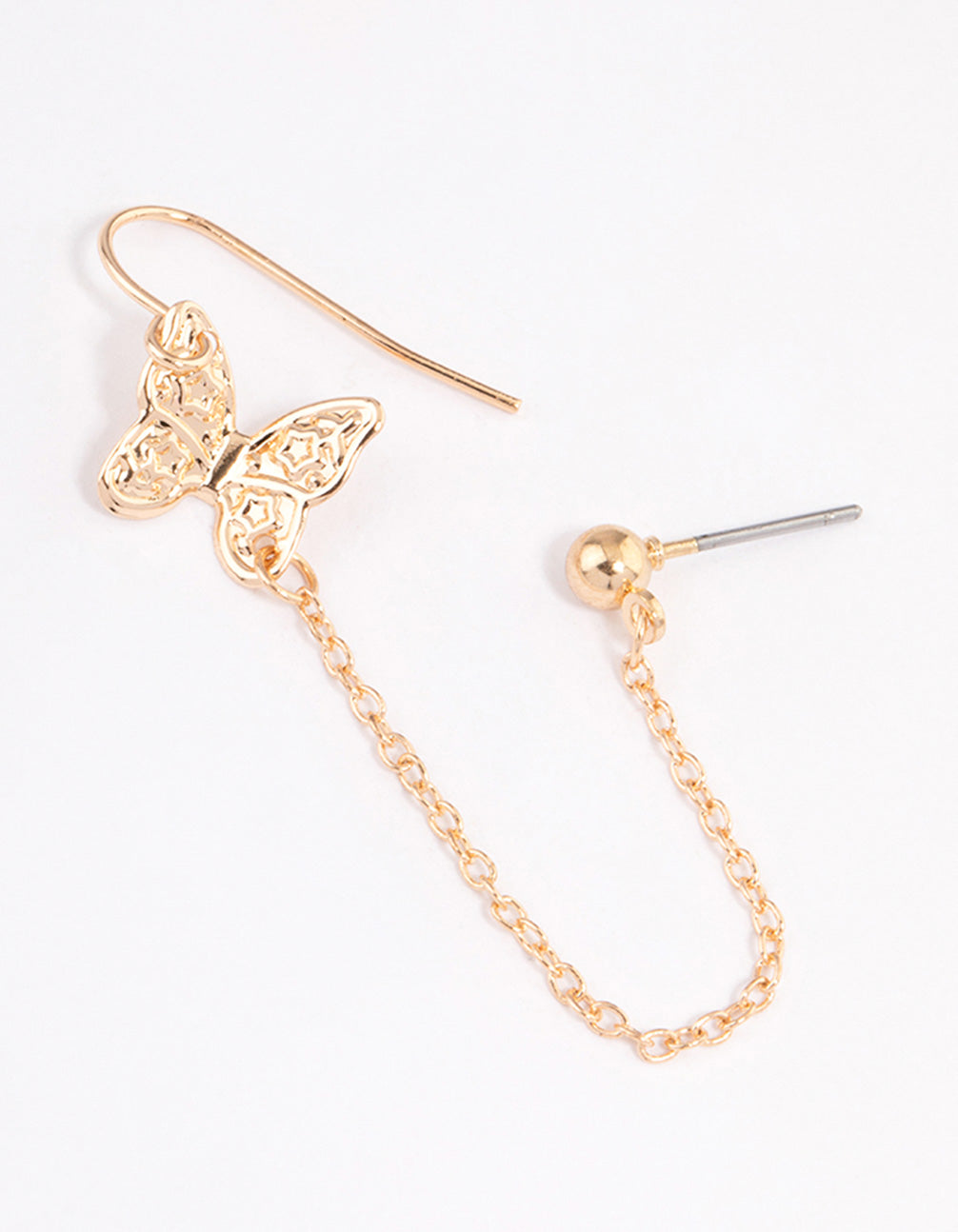 This set of stud earrings features a gorgeous, gold setting and a butterfly motif, drop chain design for an on-trend finish.