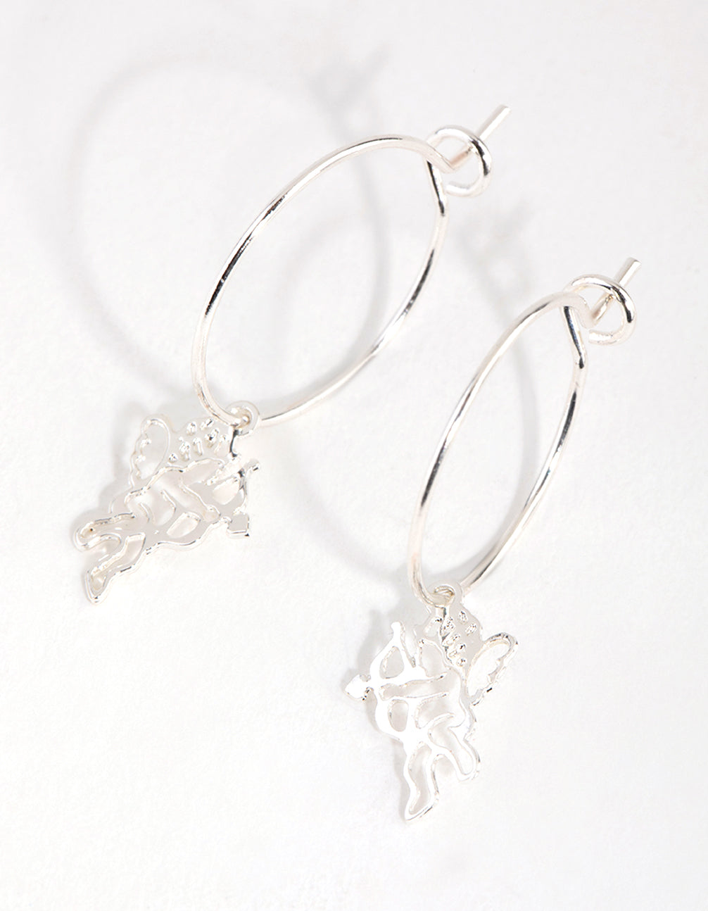Elevate your ensemble with a new pair of earrings! These huggie hoops are silver toned, and feature a cute hanging cherub charm. Wear them in an ear stack for maximum impact.