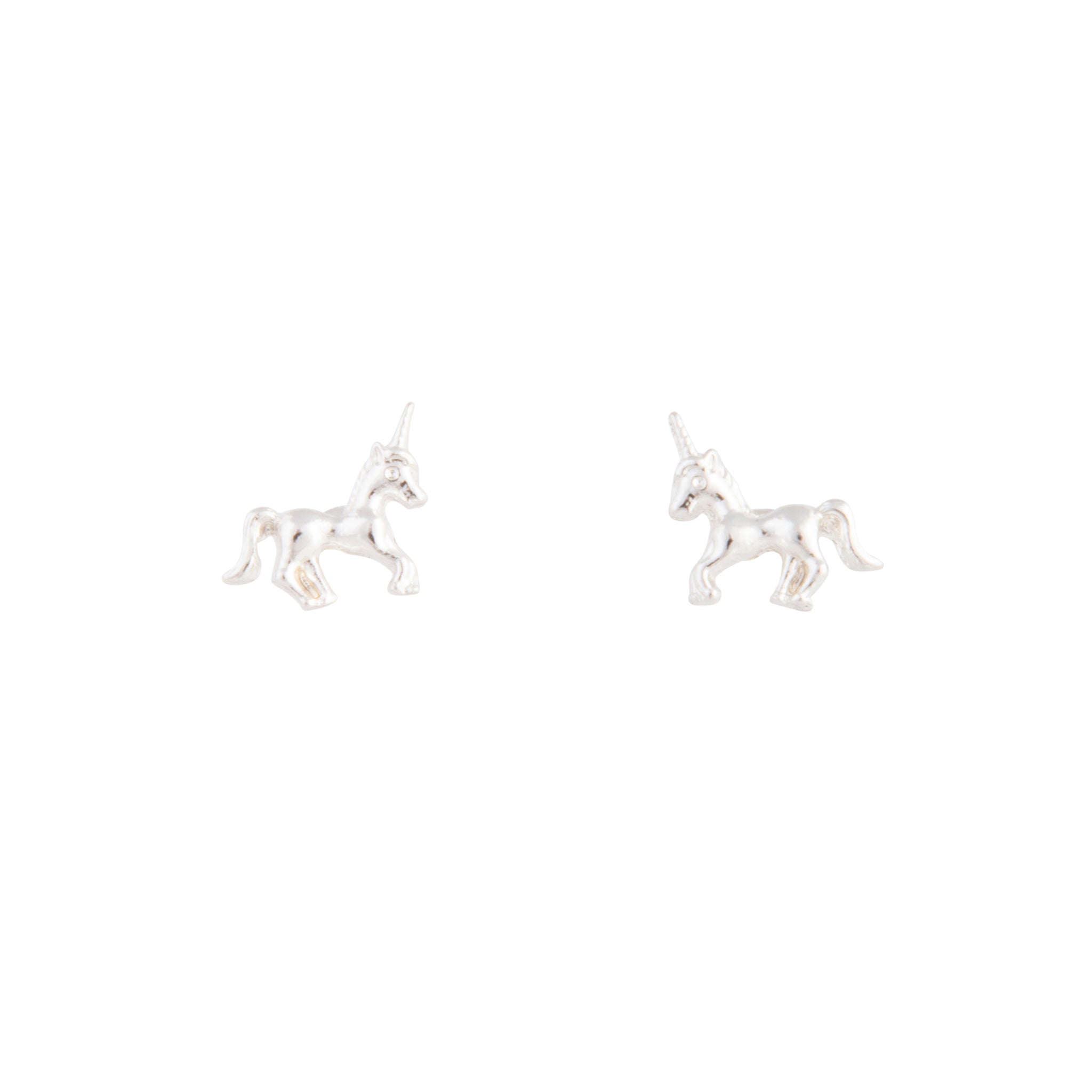 A pair of silver-toned stud earrings featuring a unicorn design.