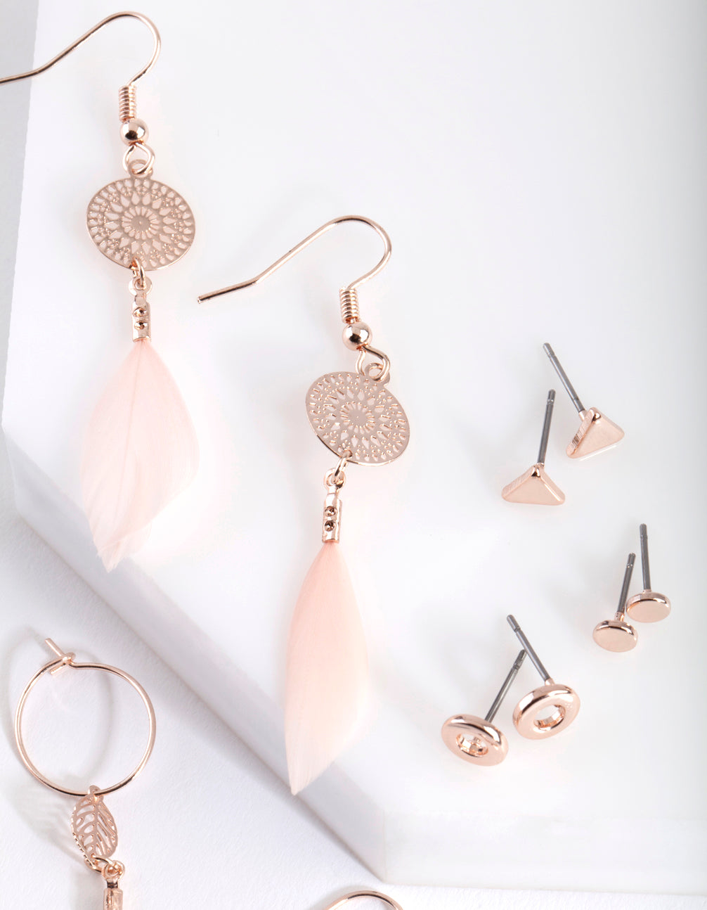 This rose gold-tone earring set is the perfect way to add variety to your look. Featuring geometric studs and hoops with filigree pendants and pastel coloured feathers.