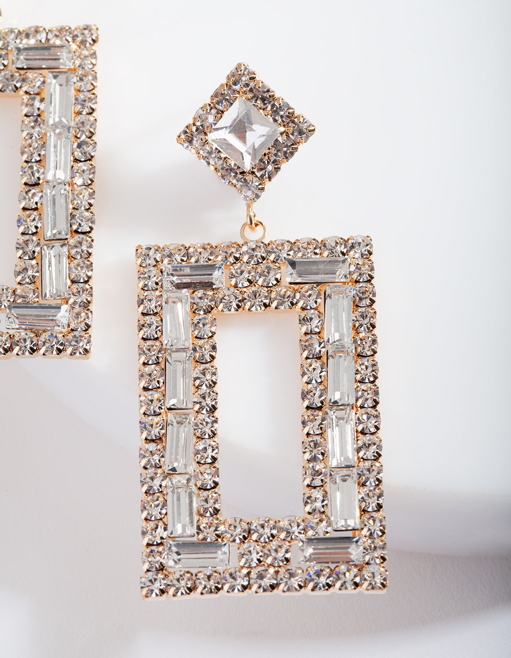 These gold-toned square shaped earrings are embellished with recetangle and square shaped diamantes to add a touch of sparkle to your evening look.