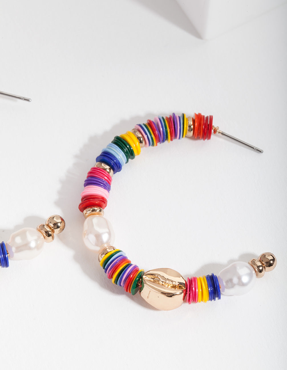 Keep it colourful with these stunning beaded hoops! They feature an open-hoop design with multicoloured beads, faux pearls and gold-toned shell details. Very on-trend, wear them and make a statement!