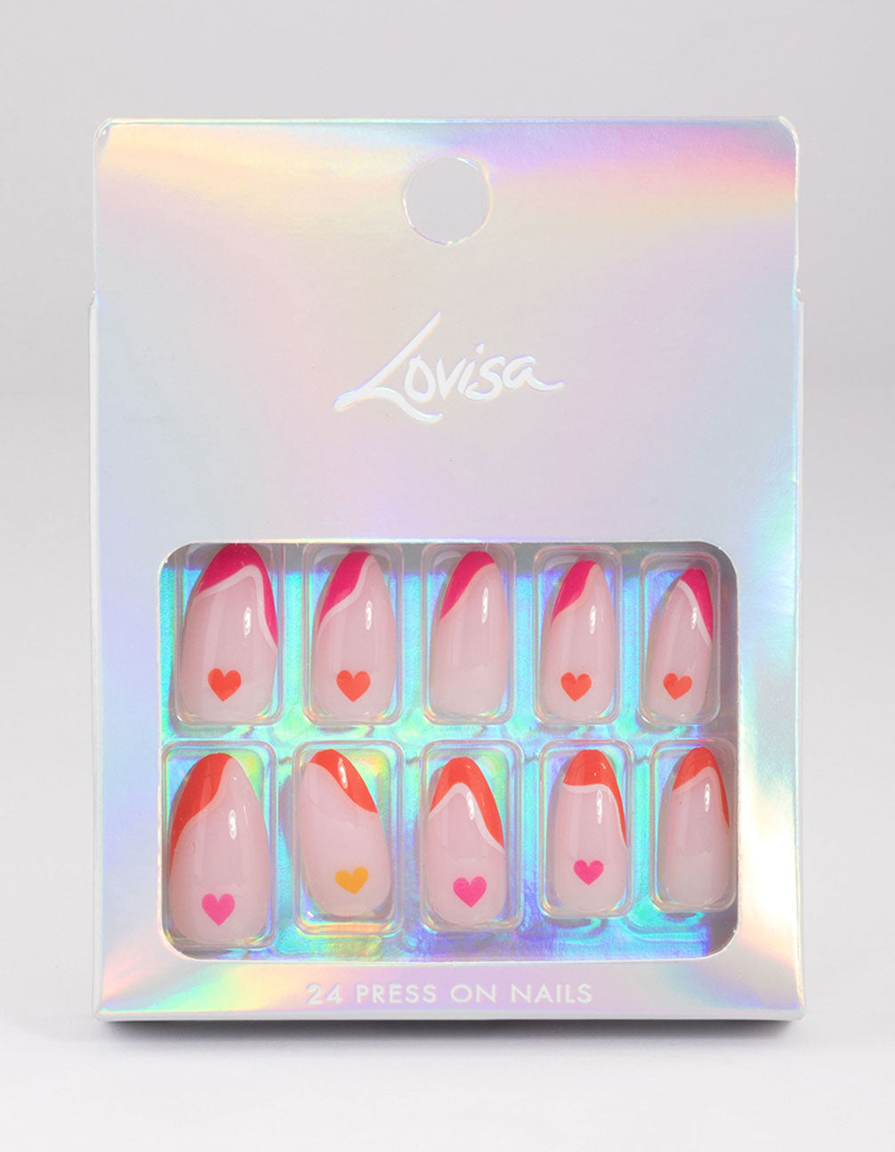 Style these bright heart design press on nails with an adorning ring stack for an on-trend look.