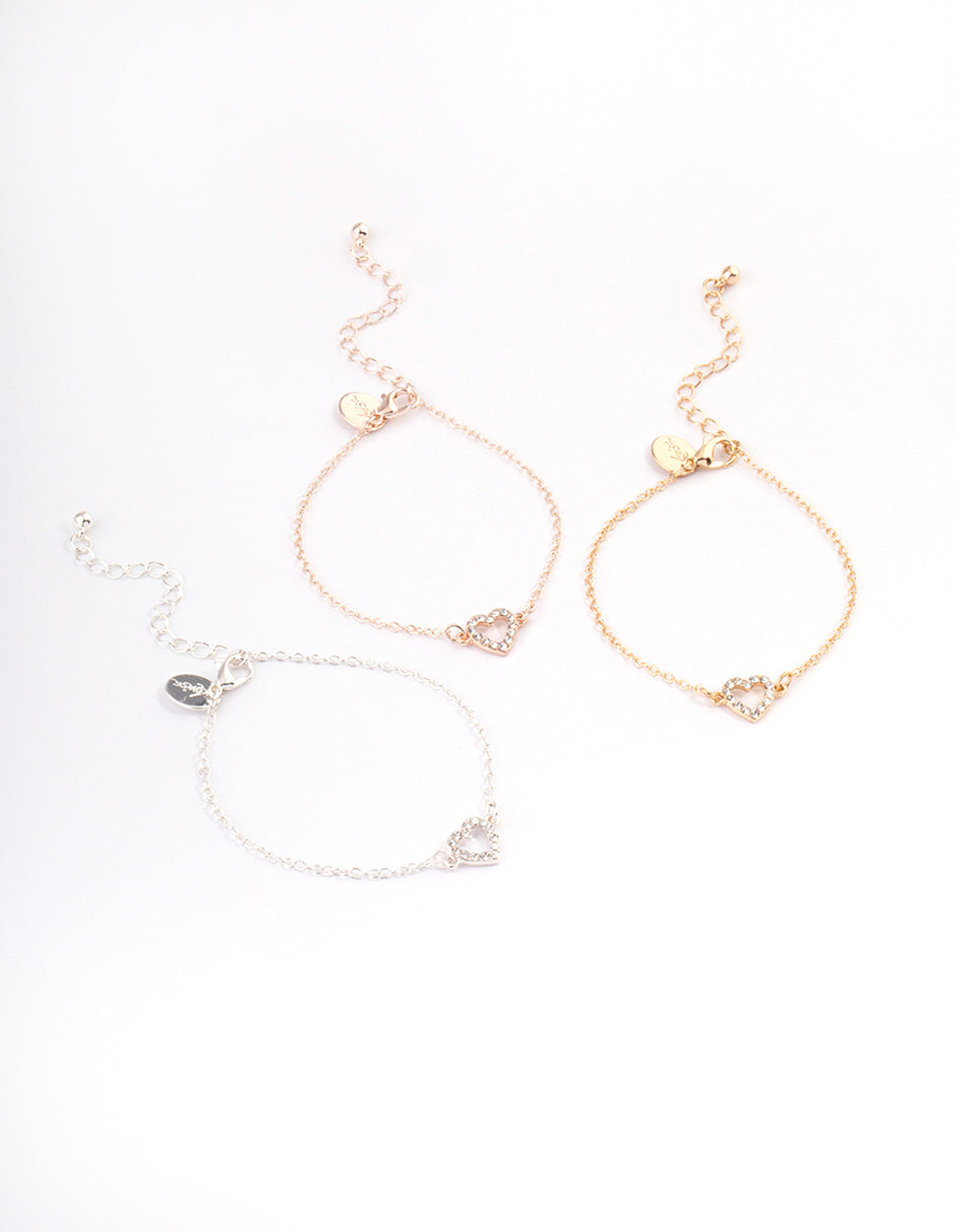 Mixed Metal Diamante Open Heart Bracelet Pack