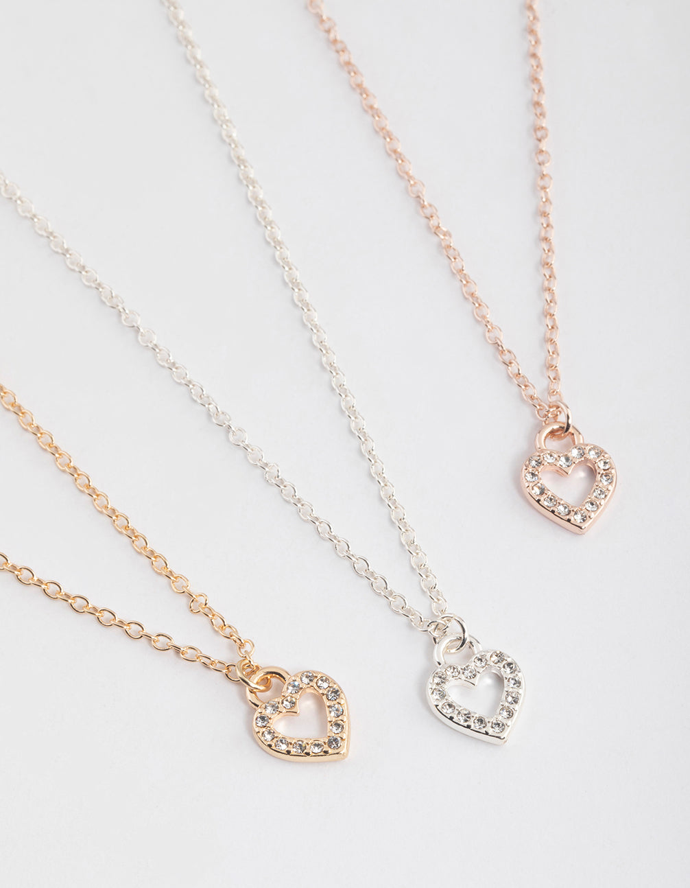 For a lovable touch, style this Mixed Metal Diamante Open Heart Necklace 3-Pack, featuring three delicate necklaces with sparkling diamante-studded open heart pendants. This set of necklaces makes the perfect gift for yourself or a loved one, and comes wrapped in a Lovisa gift box.