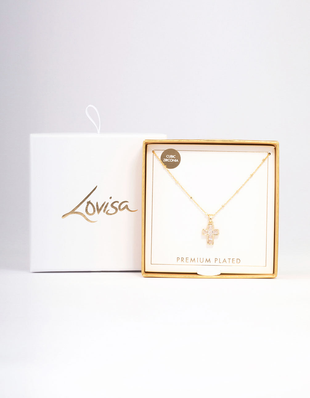 This gift box contains a genuine gold plated pendant necklace with a simple crystal cross charm for a timeless look.