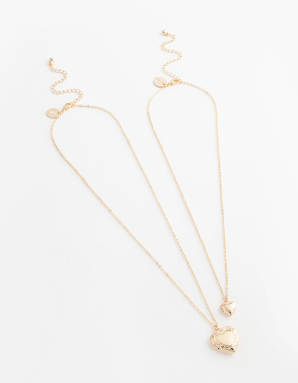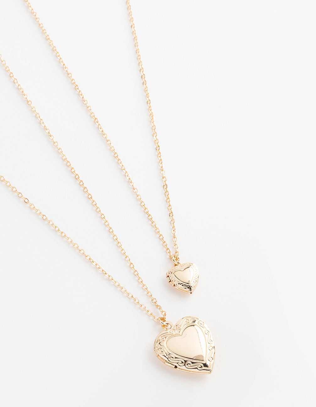 This necklace pack contains two gold pendant necklaces, adorned with intricate heart lockets for a timeless look.