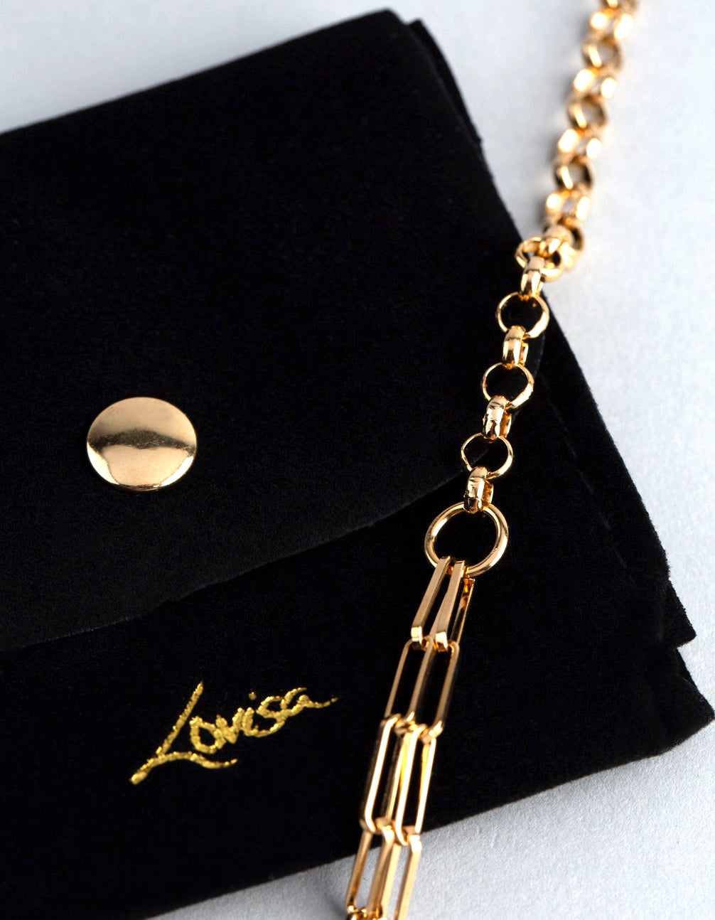 A lovely gold-plated chain adds a delicate touch of luxury to your ensemble. This Lovisa Black Label half and half chain bracelet boasts both a round and rectangular chain design, so you can wear it as you like. It is made from 925 sterling silver (stamped with signature 925 to indicate authenticity and purity) that has been plated with 1 micron of real gold. Pair with our Gold-Plated Half & Half Chain Necklace, layer it with other pieces or look effortlessly chic and wear it on its own.