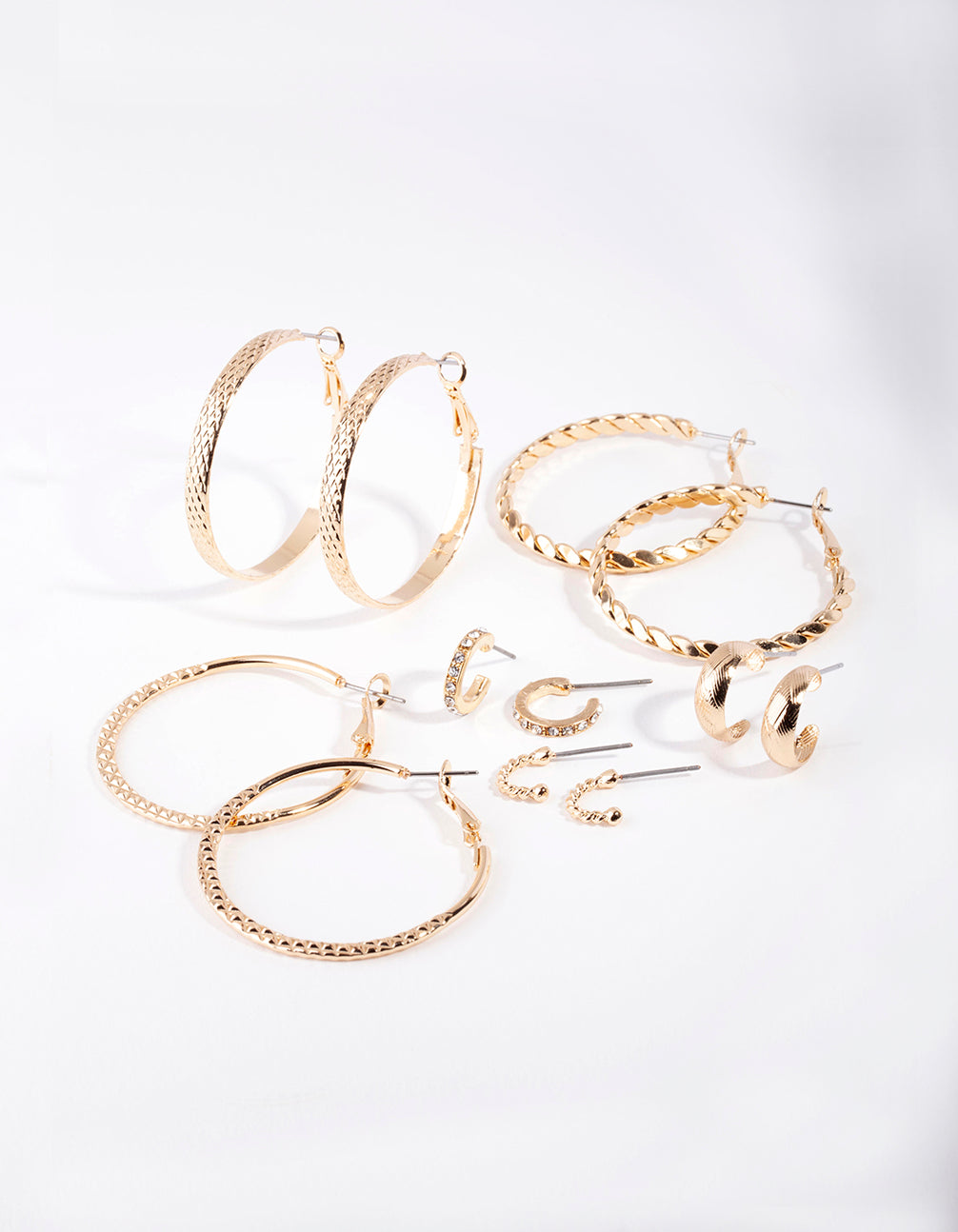 Adorn your ears with a perfectly curated earring stack. This pack comes with 6 pairs of gold-toned earrings with textured finished, making it easy to finish off your look.