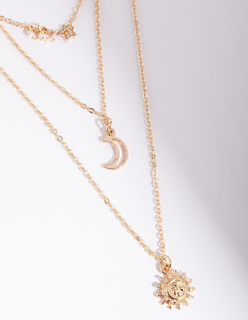 Layer it up with finer chains or wear alone for a considered look. Nearly every outfit can be elevated with neckwear. This necklace boasts a layered gold-toned design with celestial themed charms!