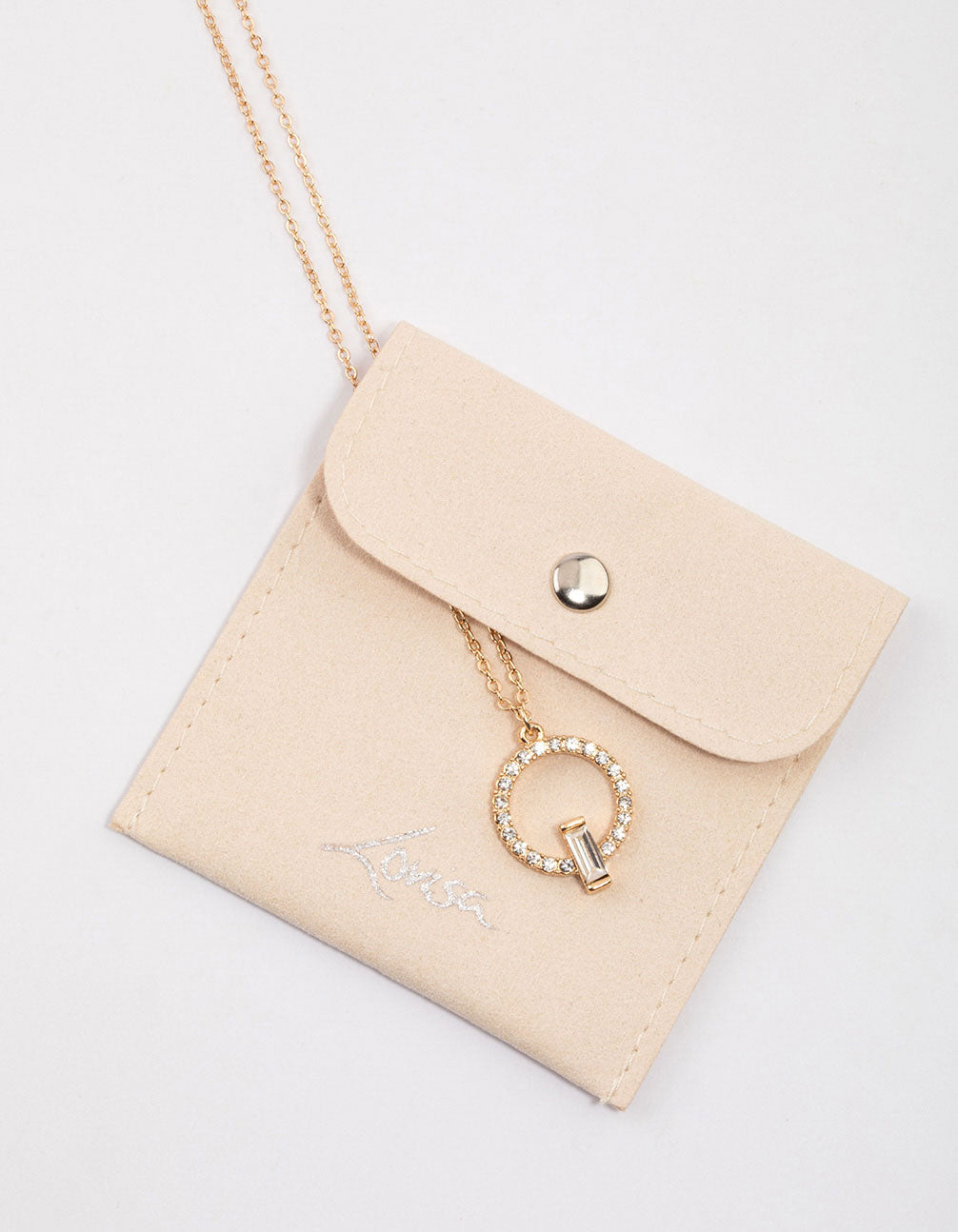 • Style this Gold Open Circle Baguette Necklace with a dainty choker and pop it back in its pouch when you're done styling.