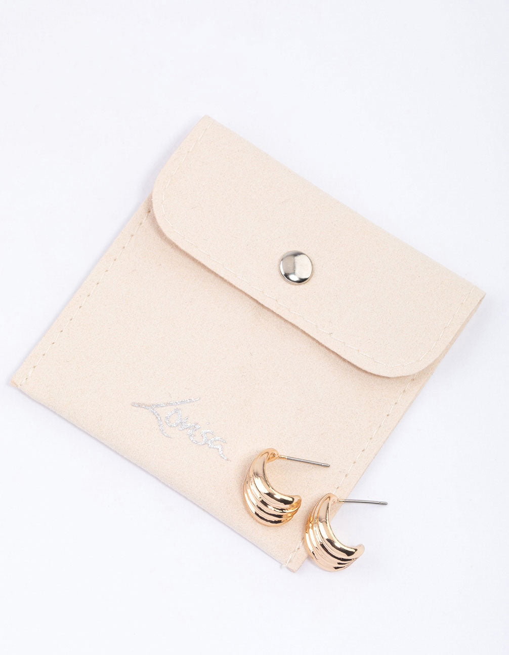 - Style these Gold Raked Huggie Earrings with a set of simple studs for a curated stack, and pop them in their pouch when you're done styling to help them keep their shine.