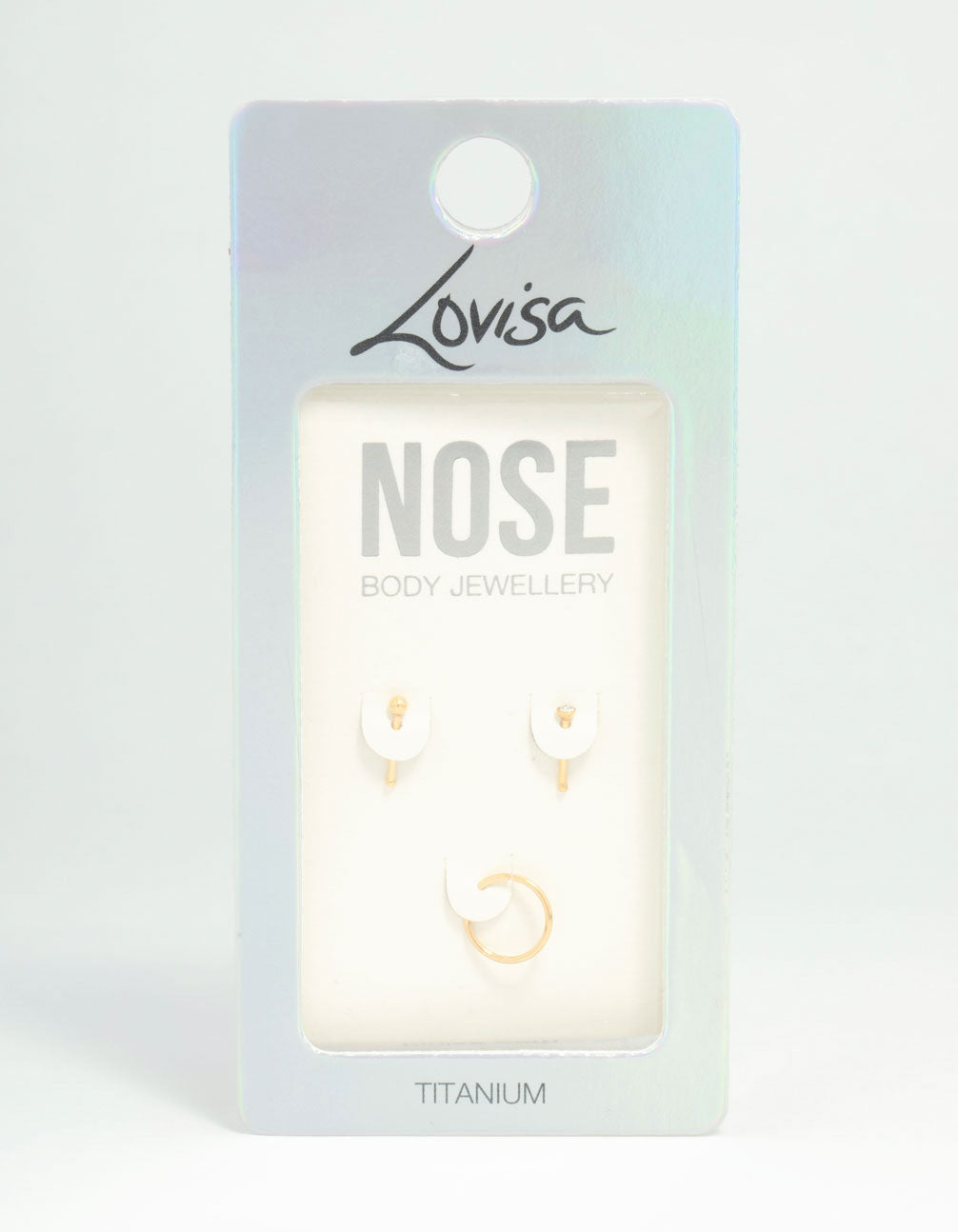 Gold Plated Titanium Ball & Diamante Nose Stud & Ring 3-Pack