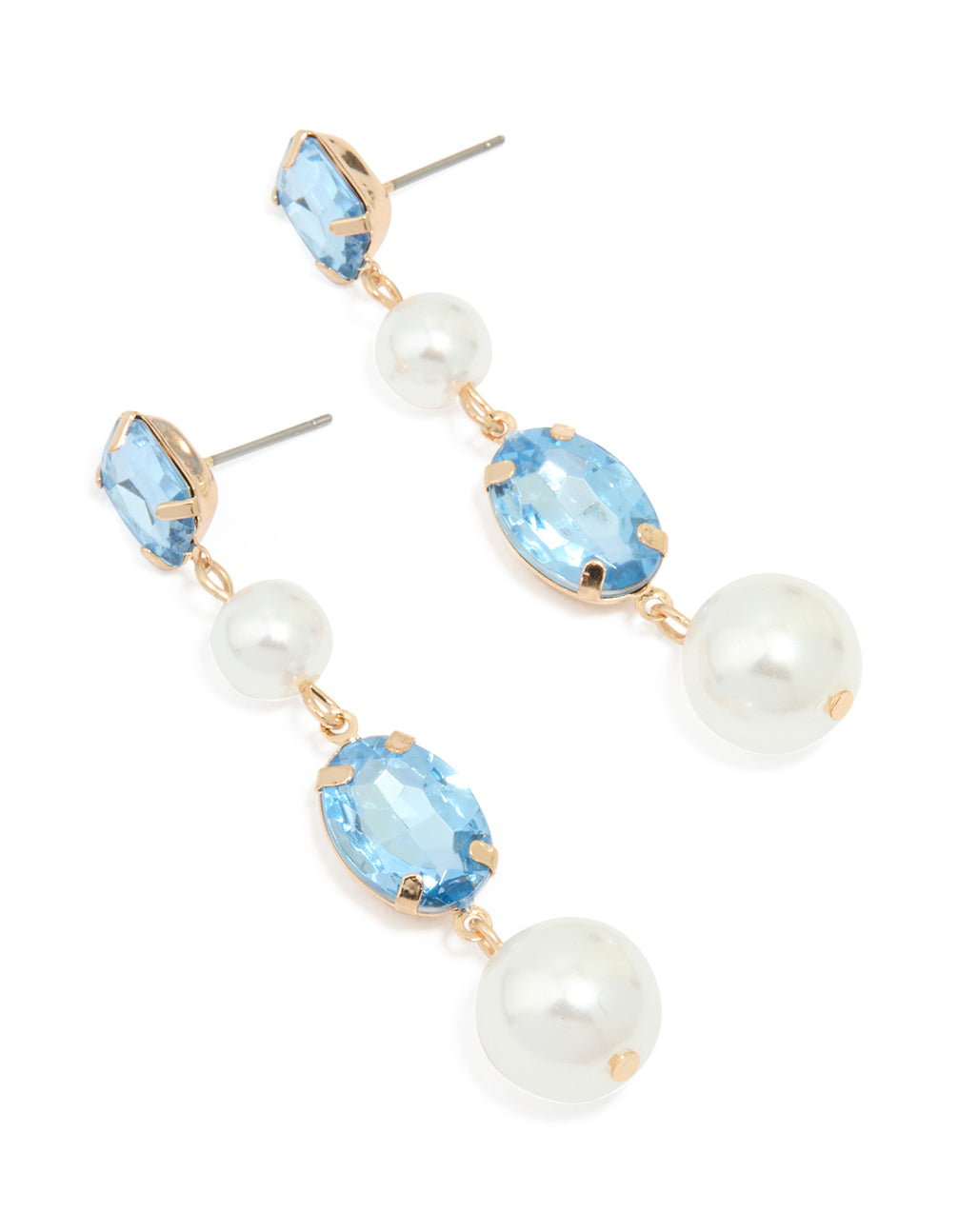 Gold Blue Diamante Pearl Long Drop Earrings