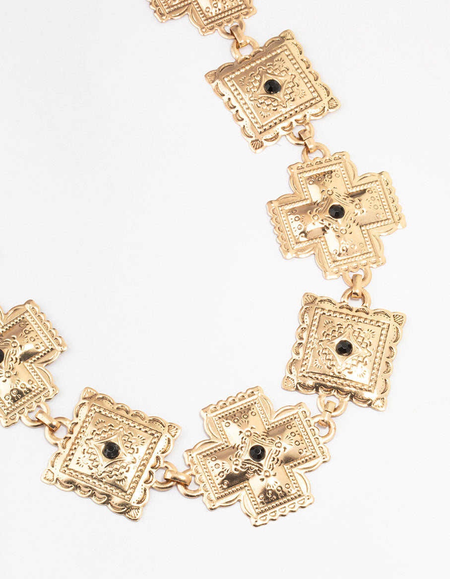 Add bohemian flair with our gold belt, featuring a square buckle adorned with an ornate cross design. Crafted from gold tone metal, it enhances any outfit, whether casual or dressy, worn at the waist or hips.