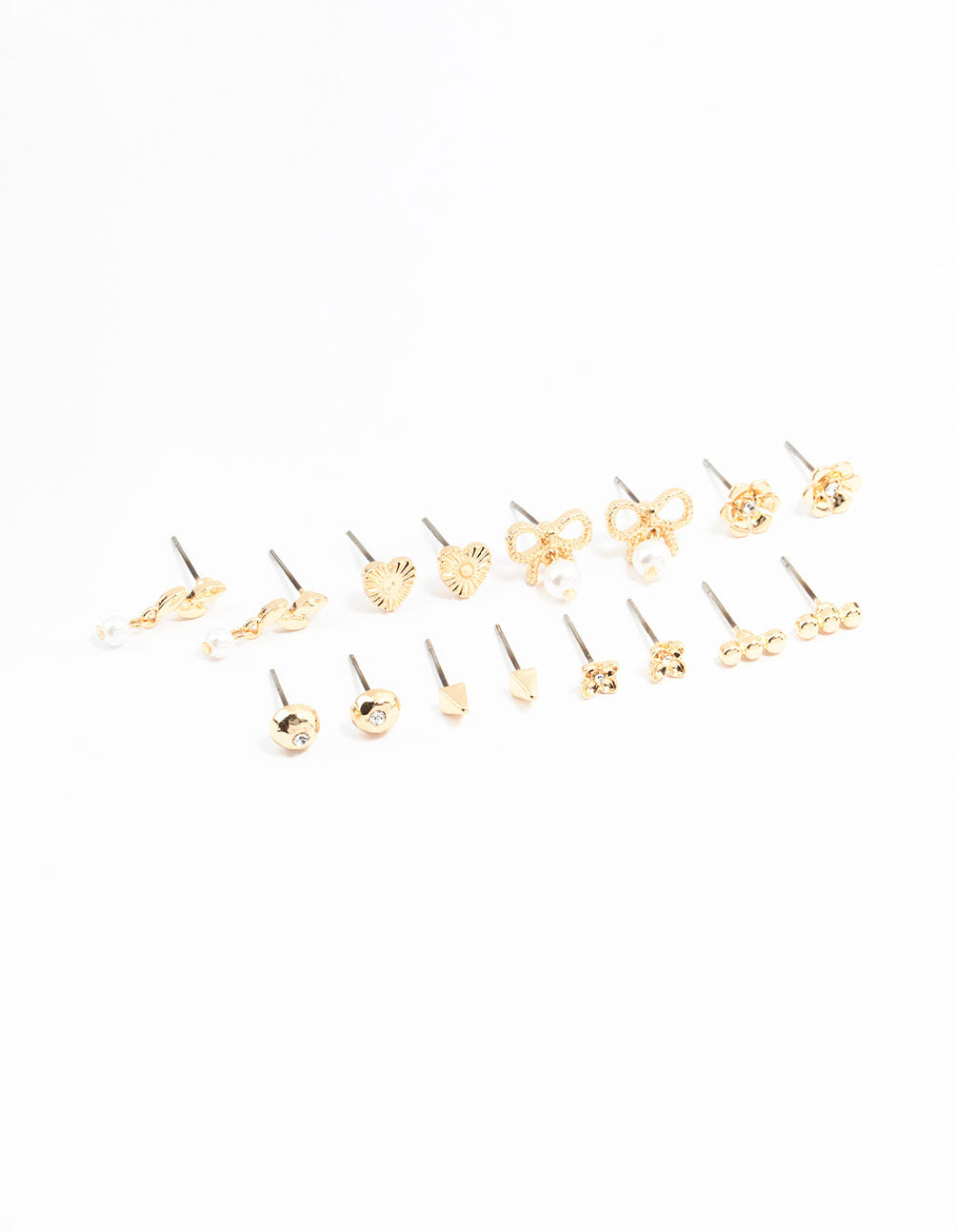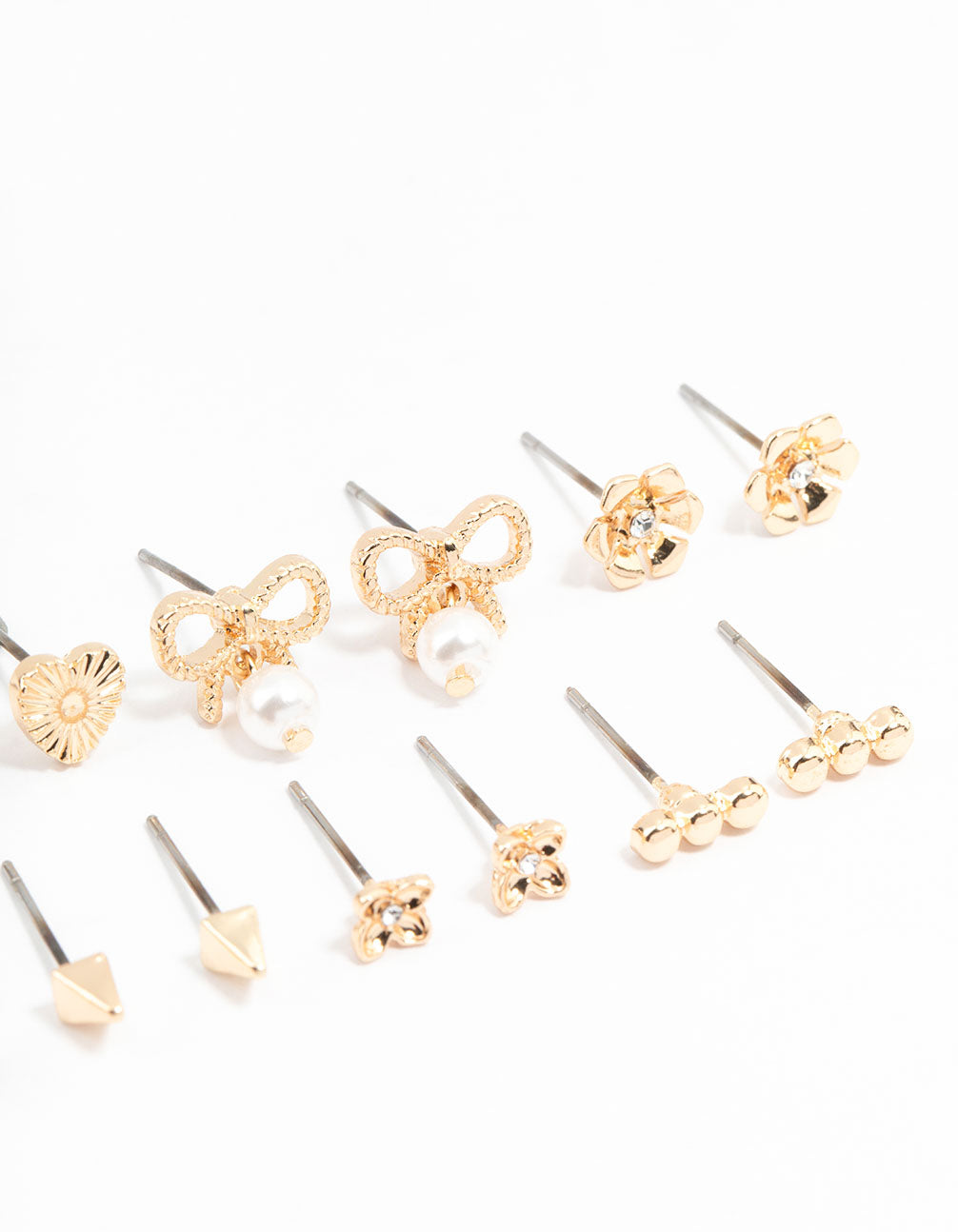 Elevate your ear game with stacked earrings for a personalized and fun look. This pack of 8 stud earrings includes flirty bow, pearl, and floral styles, ideal for adding charm and flair to your everyday ensemble.